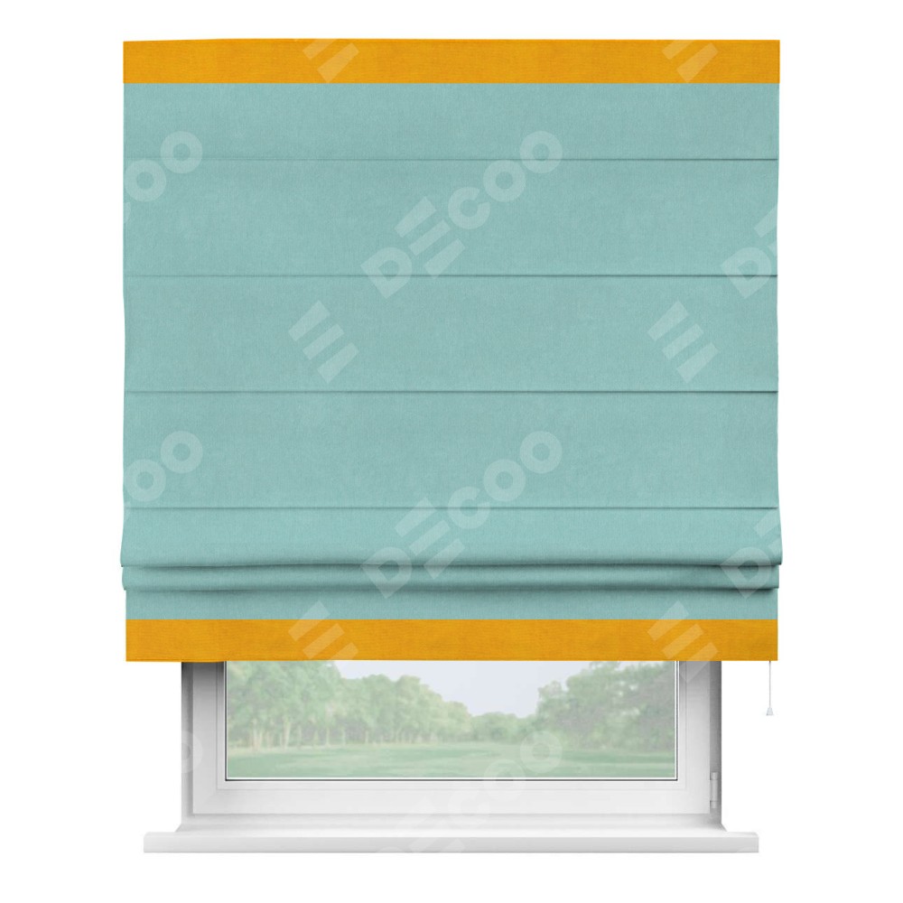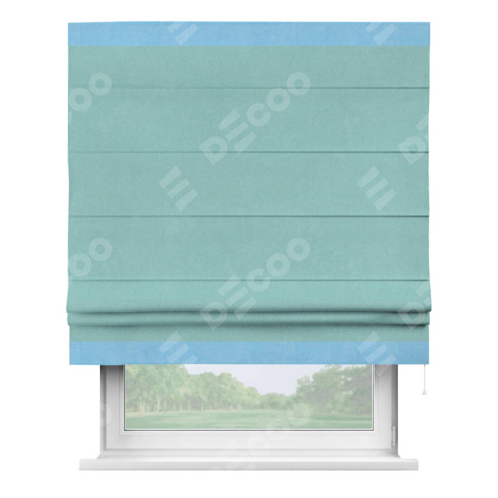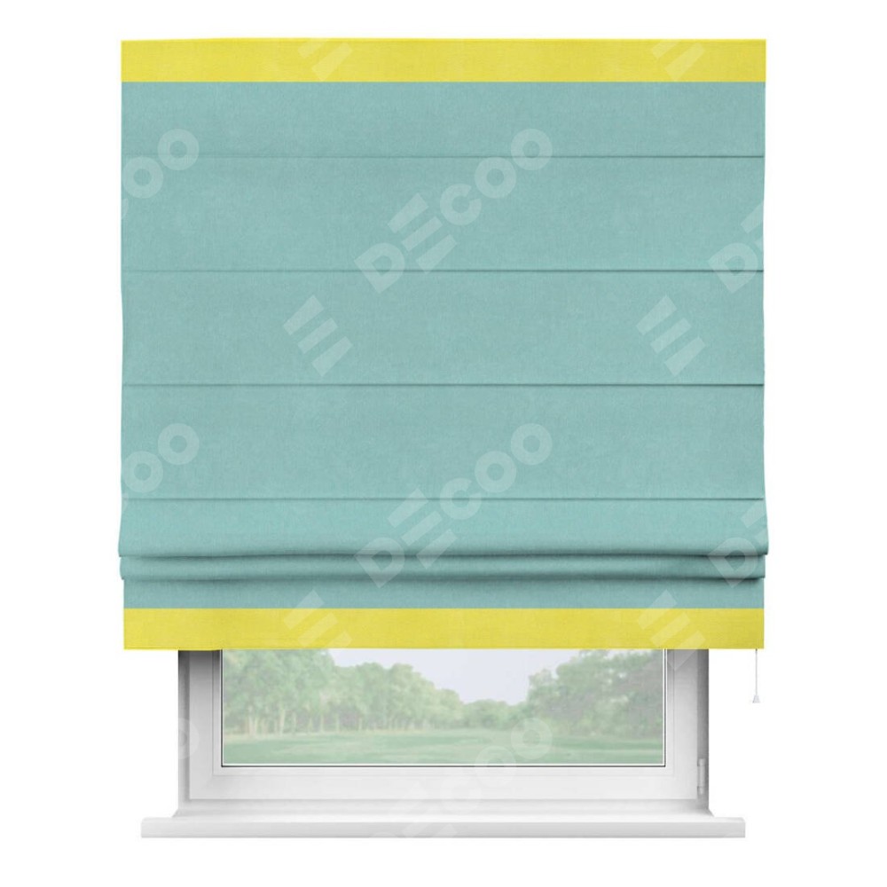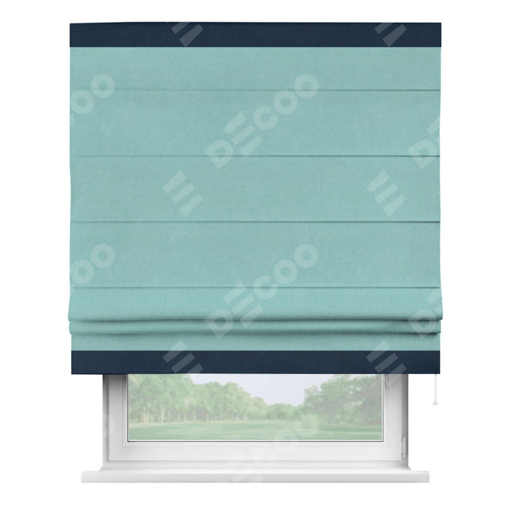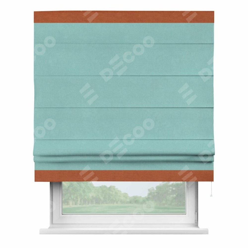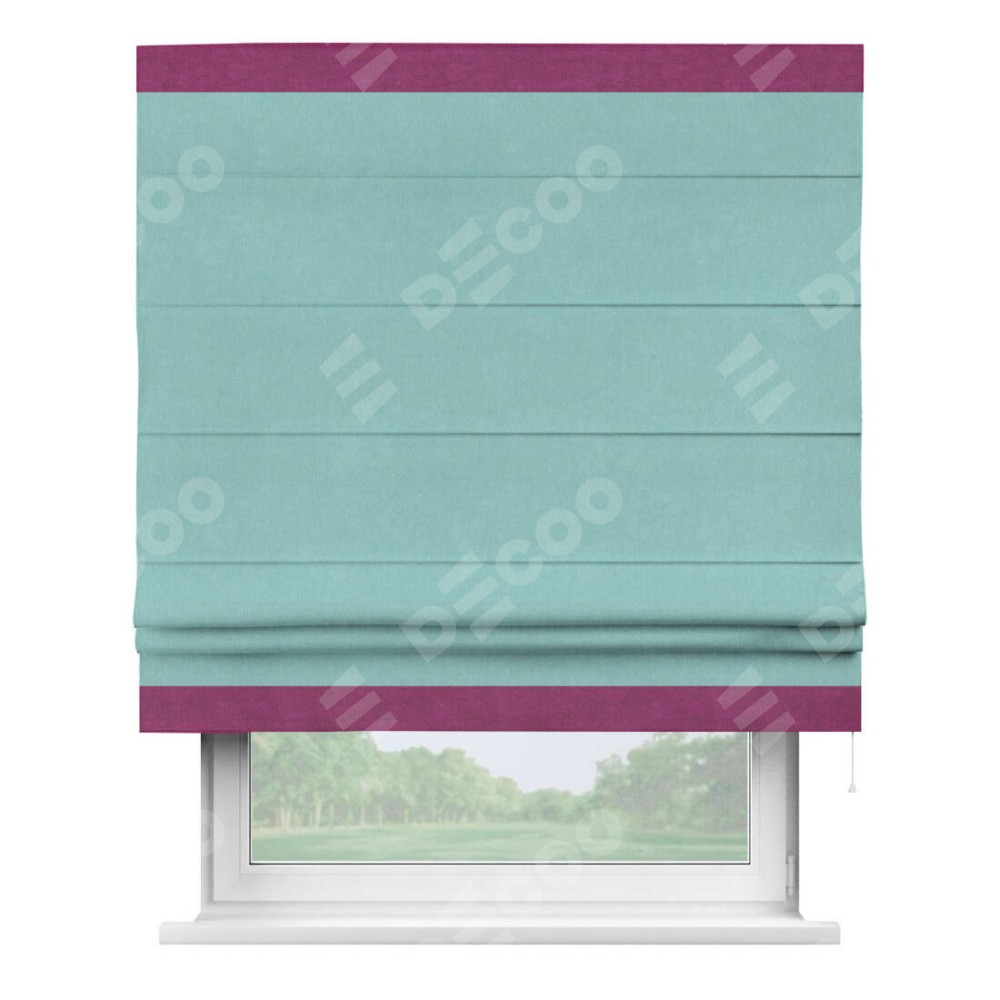 Римская штора производителя «Cortin», используется для проёма, пошита из ткани вельвет тиффани, артикул ткани 17765. Отделка шторы кантом «Горизонт», ткань для канта используется из вельвета разной расцветки на выбор. Имеет универсальный механизм и подходит для монтажа: на потолок, на стену и в нишу.
