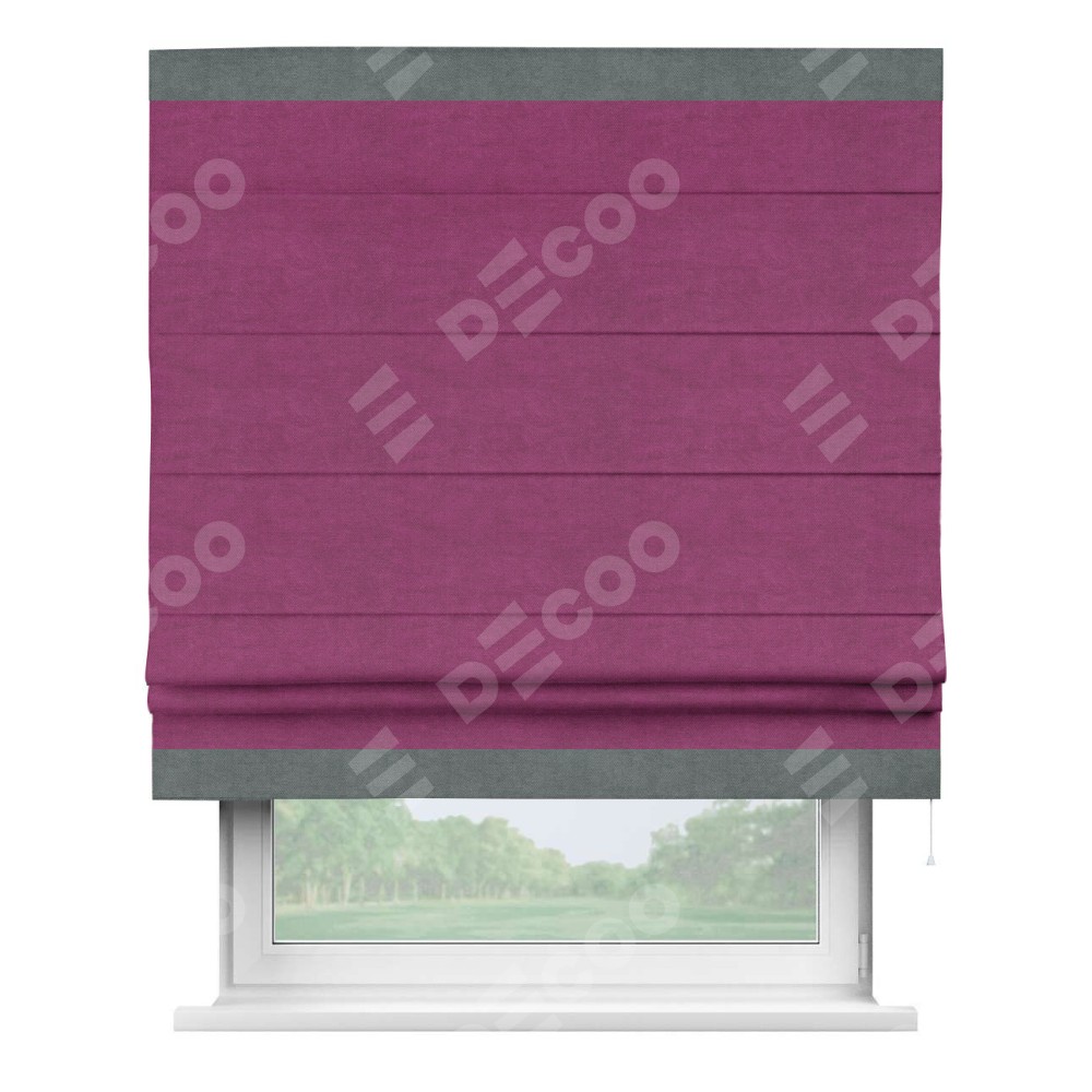 Римская штора производителя «Cortin», используется для проёма, пошита из ткани вельвет фиолетовый, артикул ткани 85552. Отделка шторы кантом «Горизонт», ткань для канта используется из вельвета разной расцветки на выбор. Имеет универсальный механизм и подходит для монтажа: на потолок, на стену и в нишу.