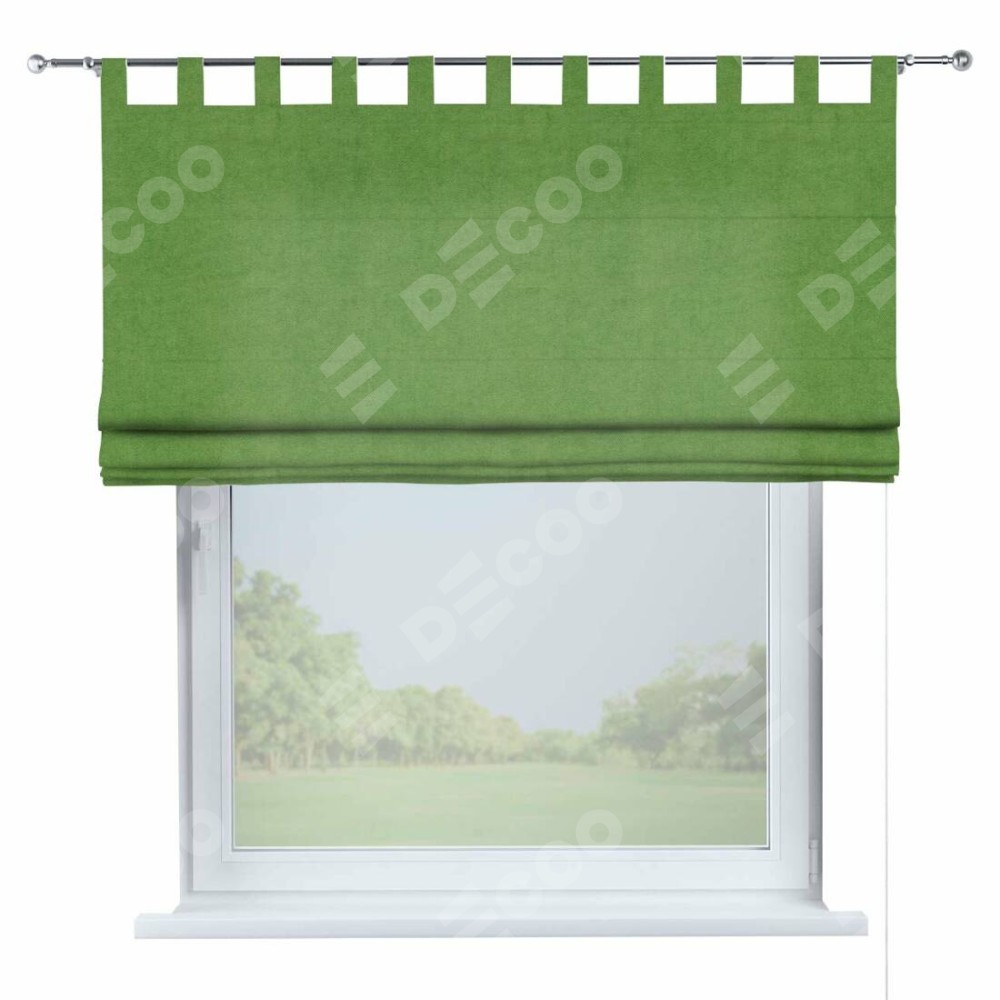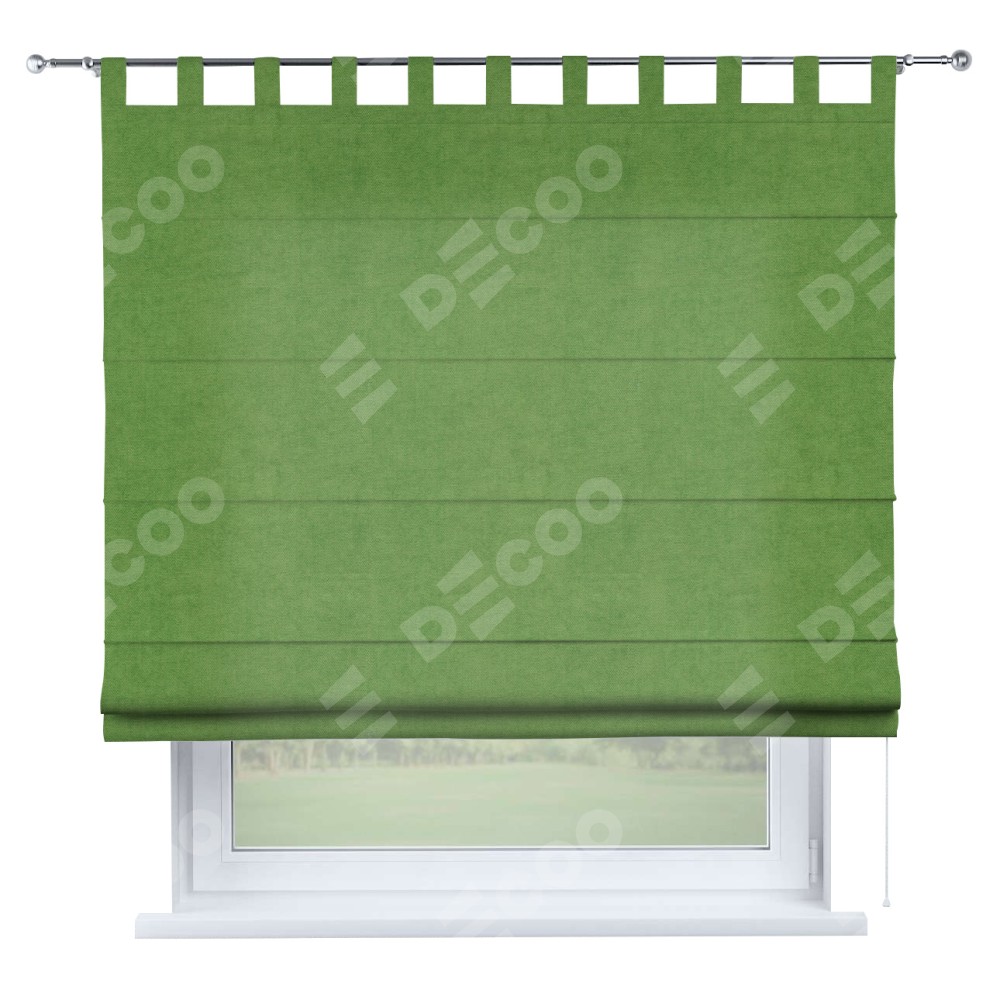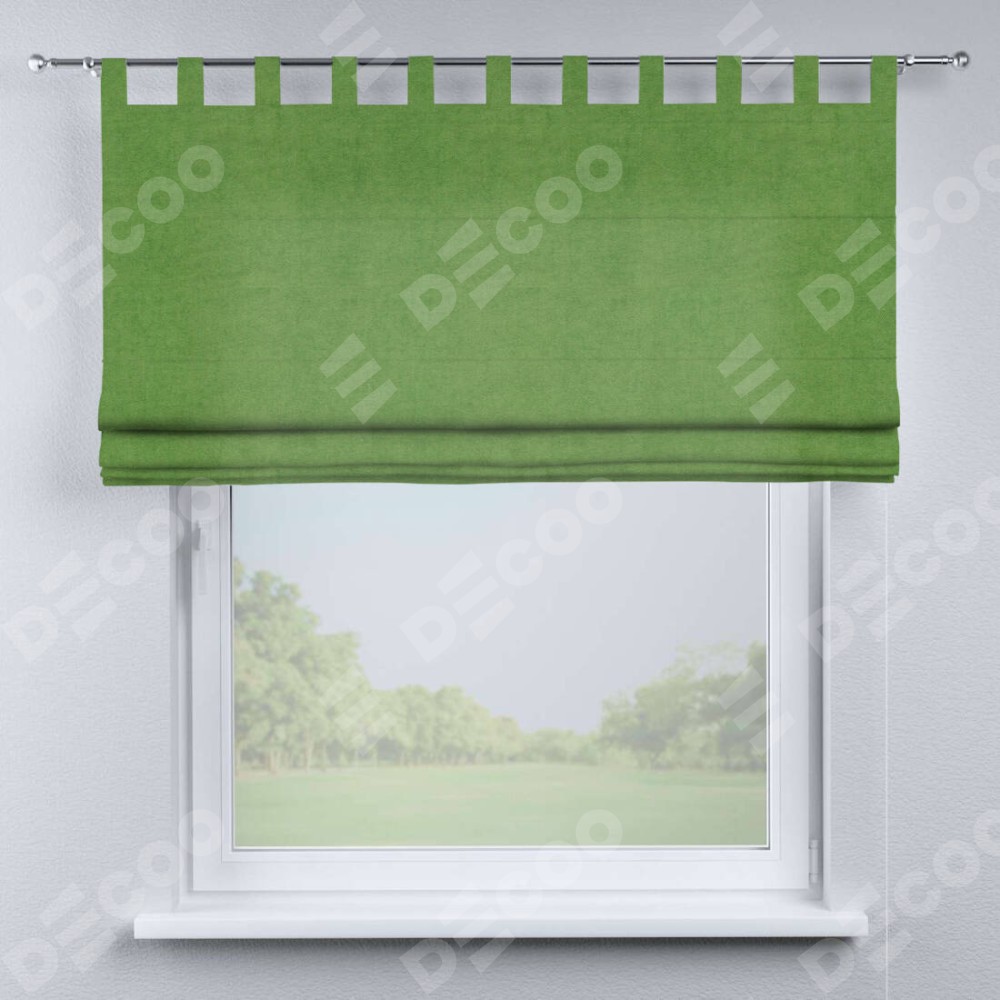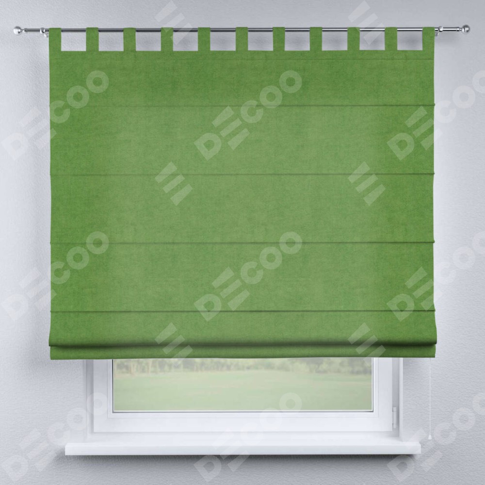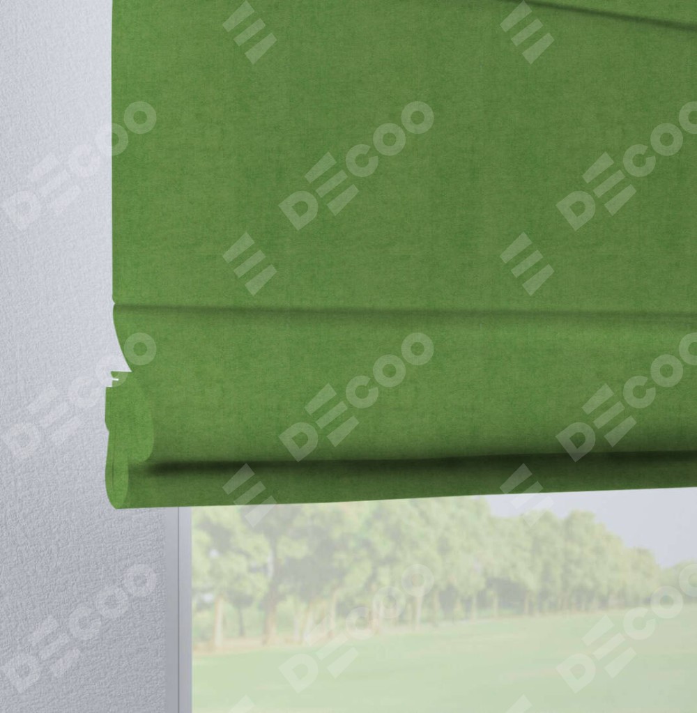 Римская штора производителя «Cortin», используется для проёма, пошита из ткани вельвет салатовый, артикул ткани 87072. Данная модель пошита на петлях, комплектуется на выбор круглым карнизом и подходит для монтажа на стену. Римская штора на петлях имеет простую систему регулировки высоты, отличительным преимуществом данной модели является простой способ монтажа. Достаточно повесить ее на трубу и штора готова!