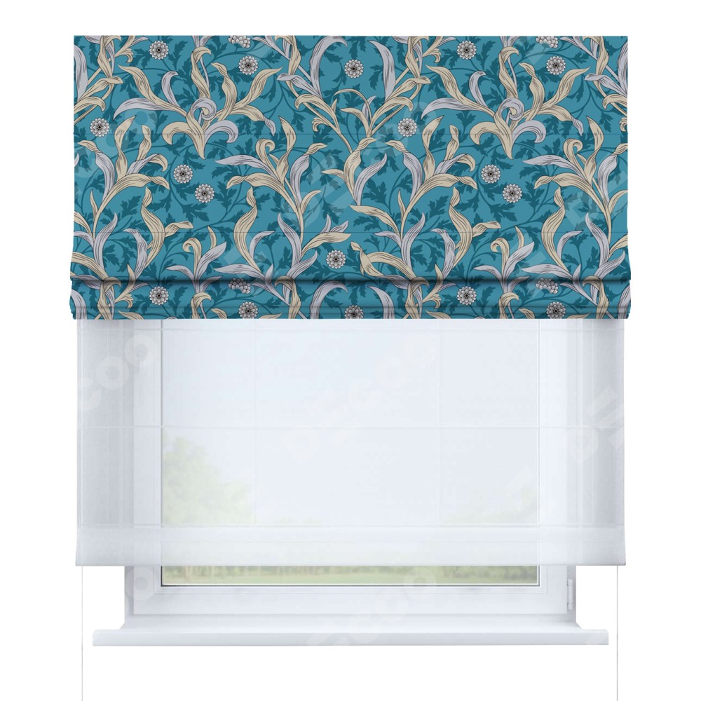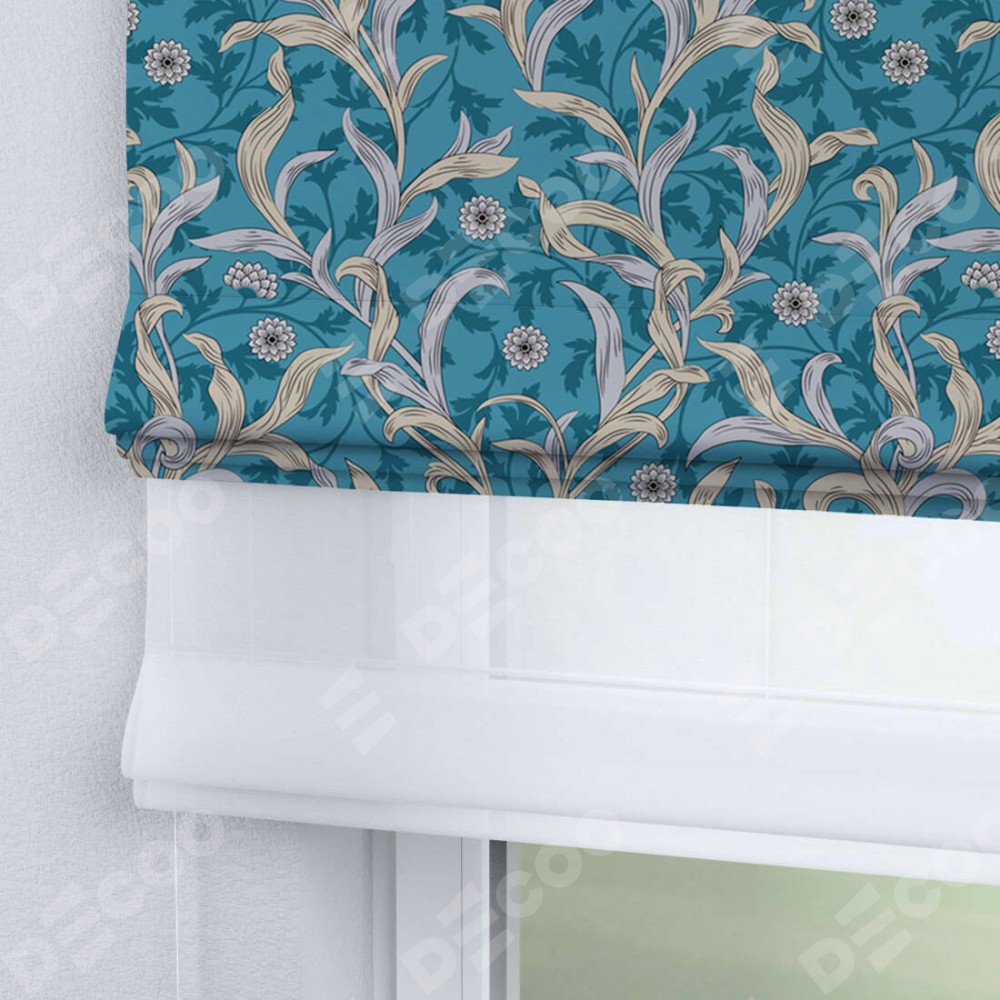 Римская штора день-ночь производителя «Cortin», используется для проёма, пошита из двух полотен, с лицевой блэкаут с нанесением сублимационной печати «Винтажные листья», вторая ткань тюль (по стандарту комплектуется тюль белого цвета артикул V-01). Имеет универсальный механизм и подходит для монтажа: на потолок, на стену и в нишу.