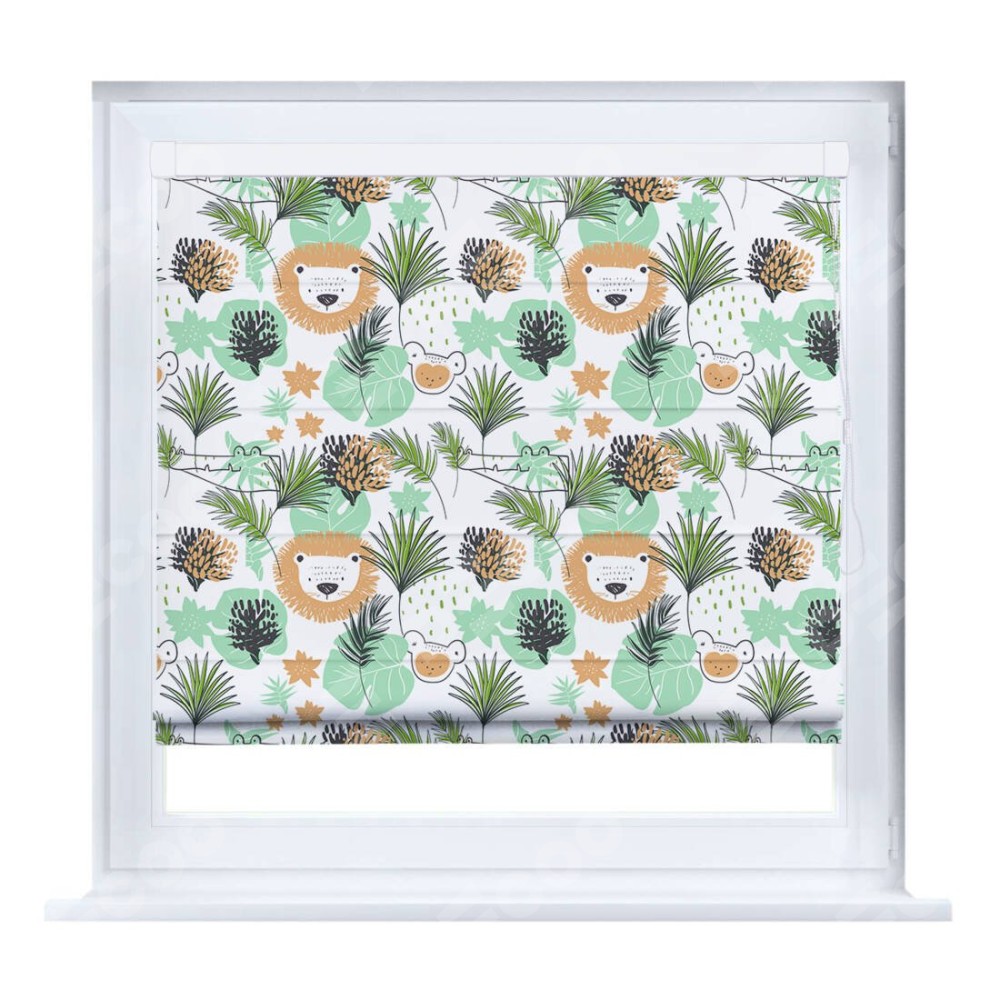 Римская штора производителя «Cortin», устанавливается на створку окна, пошита из ткани блэкаут с нанесением сублимационной печати «Животные из джунглей». Штора шьётся по индивидуальным размерам, для данного типа римской шторы возможная ширина от 35 до 150 см., высота до 250 см.