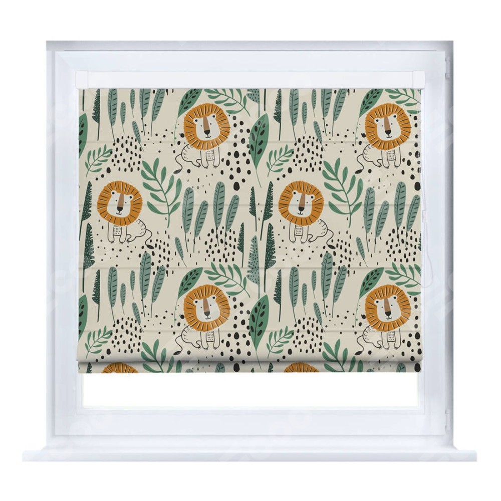 Римская штора производителя «Cortin», устанавливается на створку окна, пошита из ткани блэкаут с нанесением сублимационной печати «Лев из джунглей». Штора шьётся по индивидуальным размерам, для данного типа римской шторы возможная ширина от 35 до 150 см., высота до 250 см.