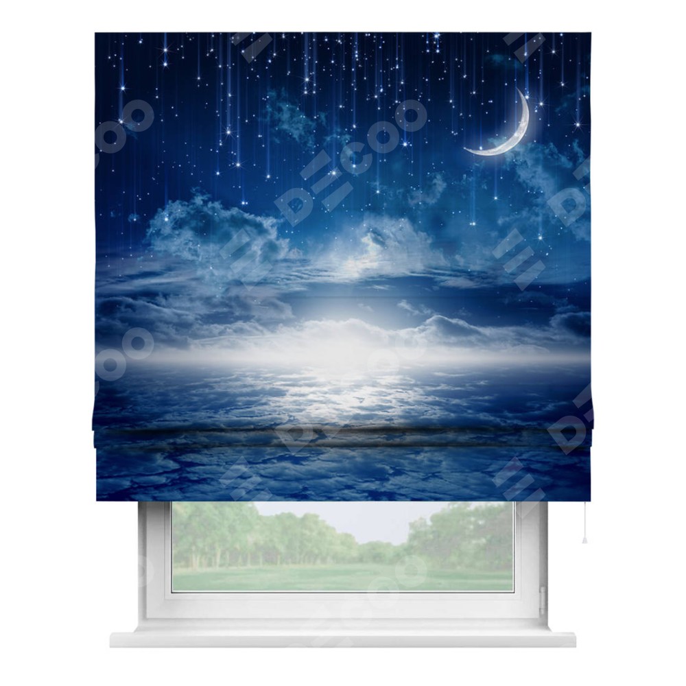 Римская штора производителя «Cortin», используется для проёма, пошита из ткани блэкаут с нанесением сублимационной печати «Ночное небо». Имеет универсальный механизм и подходит для монтажа: на потолок, на стену и в нишу.