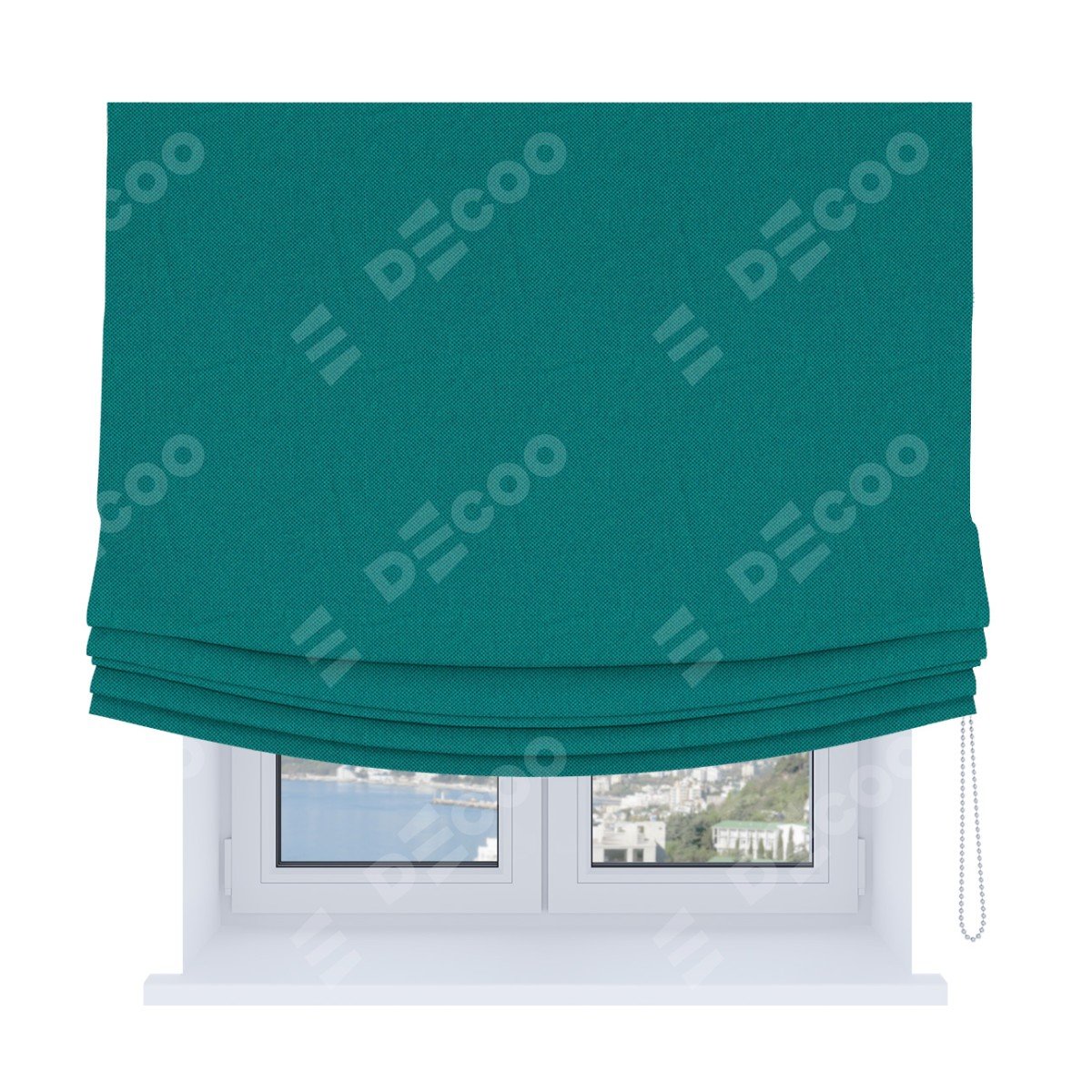 Римская штора Soft производителя «Cortin», используется для проёма, пошита из ткани лён димаут тёмно-бирюзовый, артикул ткани 318. Имеет универсальный механизм и подходит для монтажа: на потолок, на стену и в нишу. В отличие от стандартных римских штор, римская штора Soft не имеет горизонтальных вставок и нижнего отвеса. Это позволяет ткани произвольно драпироваться в свободные мягкие складки.