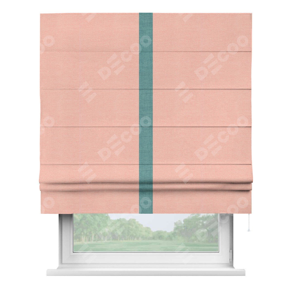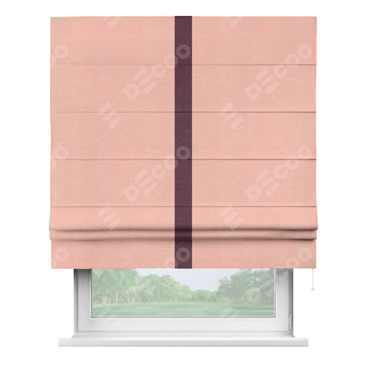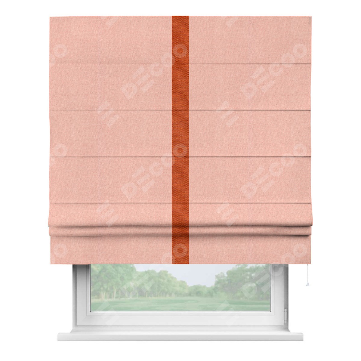 Римская штора производителя «Cortin», используется для проёма, пошита из ткани лён розовый, артикул 00005. Отделка шторы кантом «Хайвэй», ткань для канта используется из льна разной расцветки на выбор. Имеет универсальный механизм и подходит для монтажа: на потолок, на стену и в нишу.