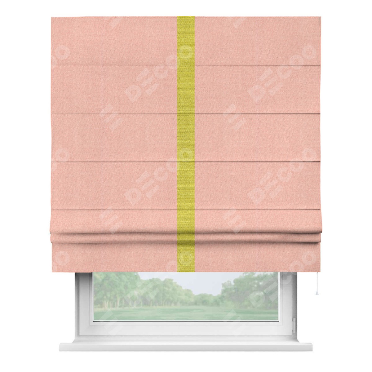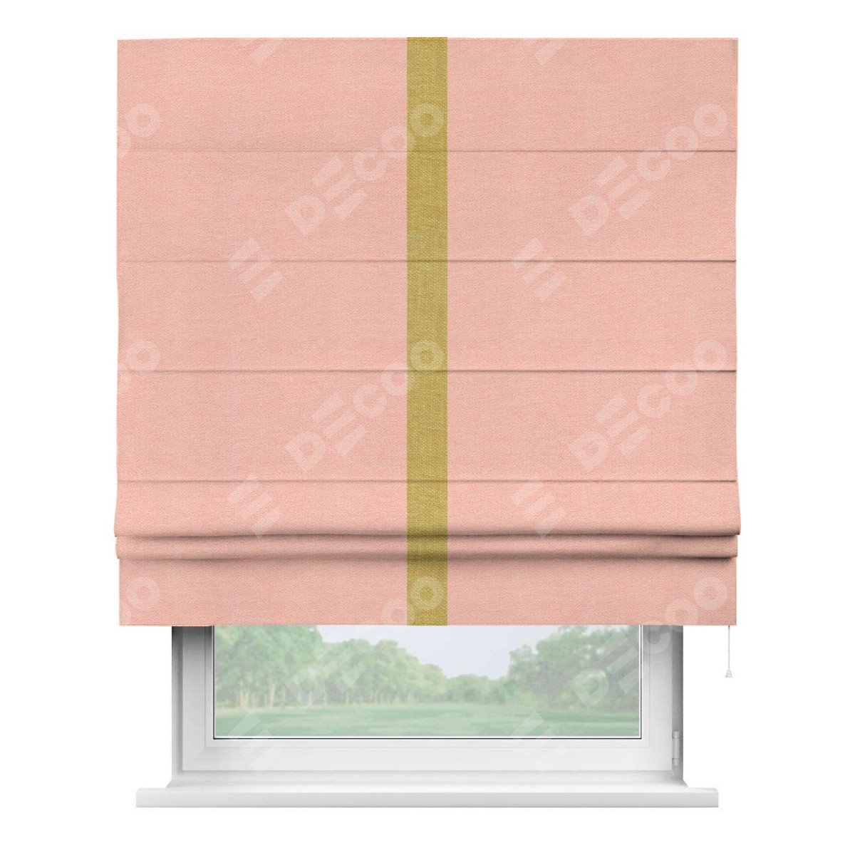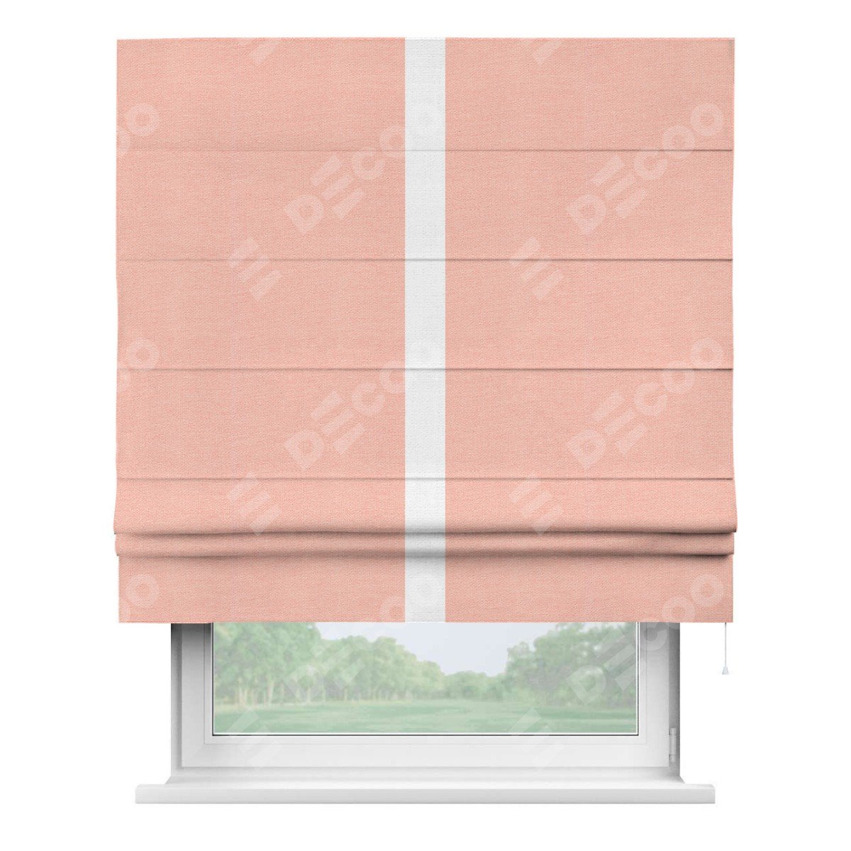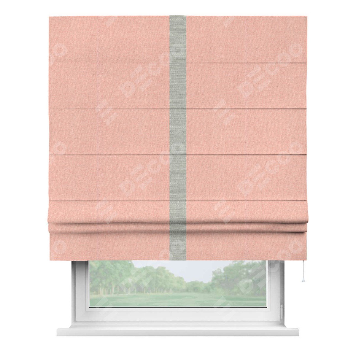 Римская штора производителя «Cortin», используется для проёма, пошита из ткани лён розовый, артикул 00005. Отделка шторы кантом «Хайвэй», ткань для канта используется из льна разной расцветки на выбор. Имеет универсальный механизм и подходит для монтажа: на потолок, на стену и в нишу.