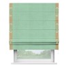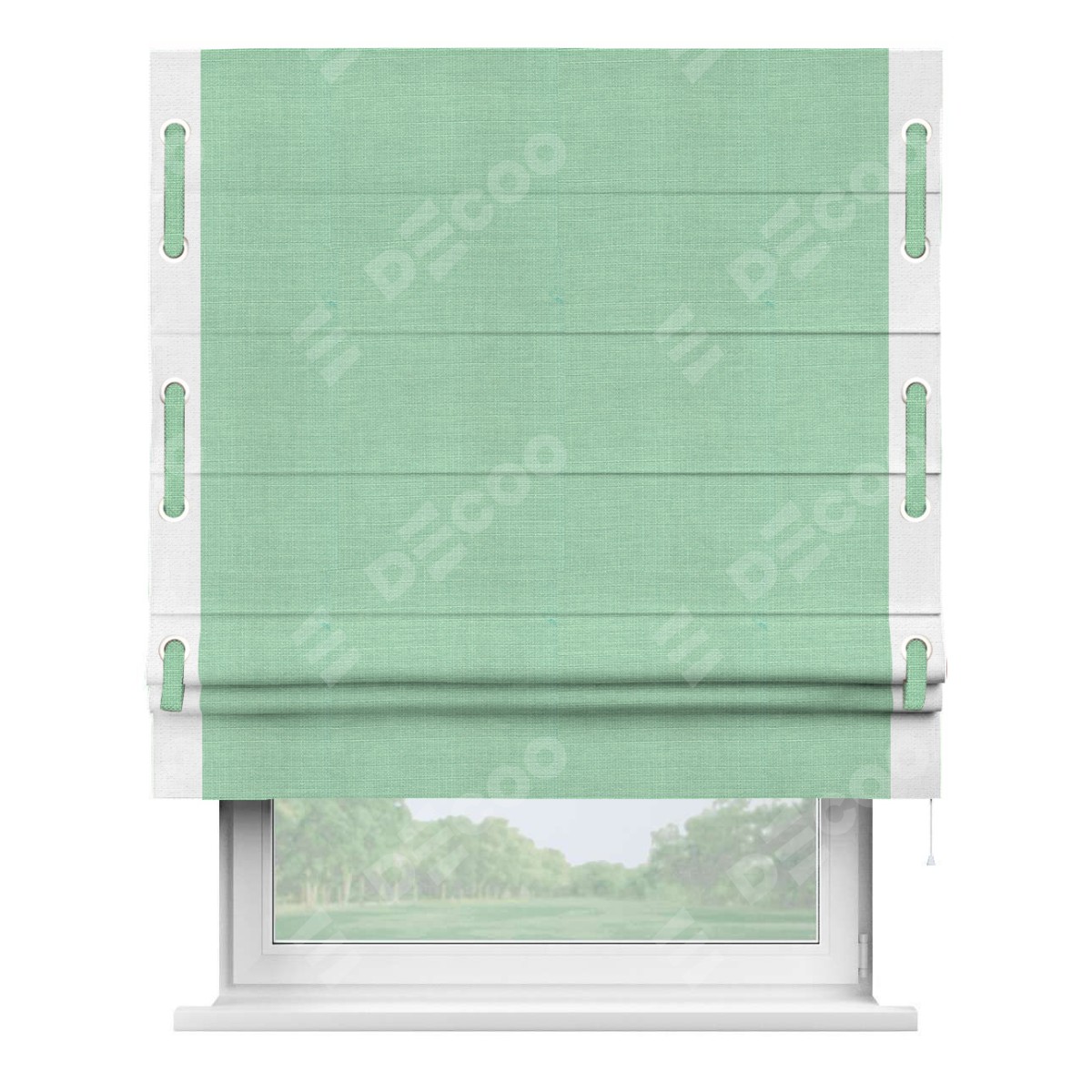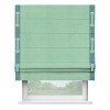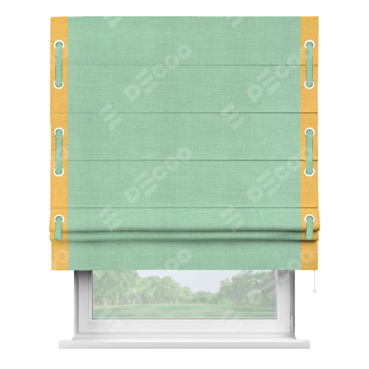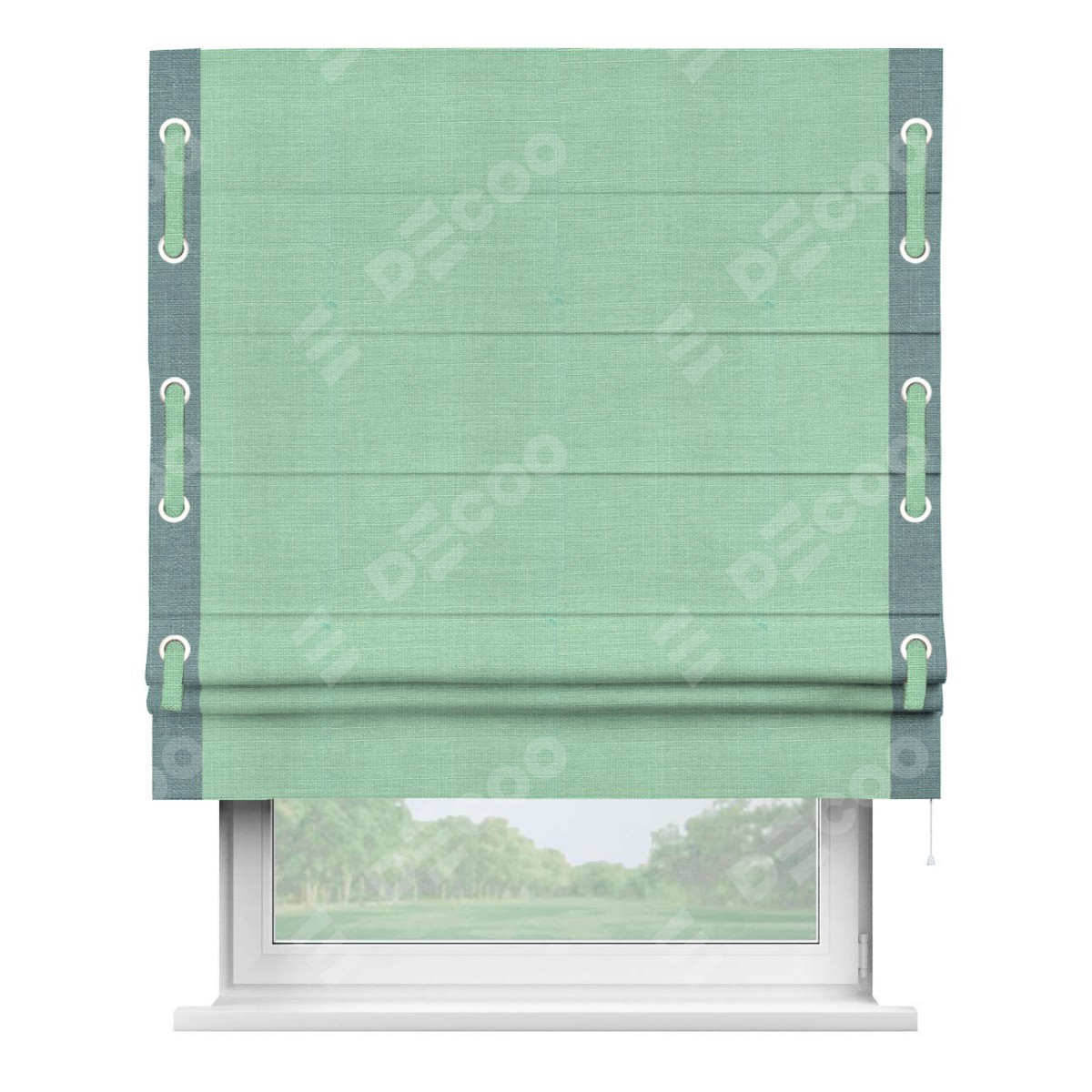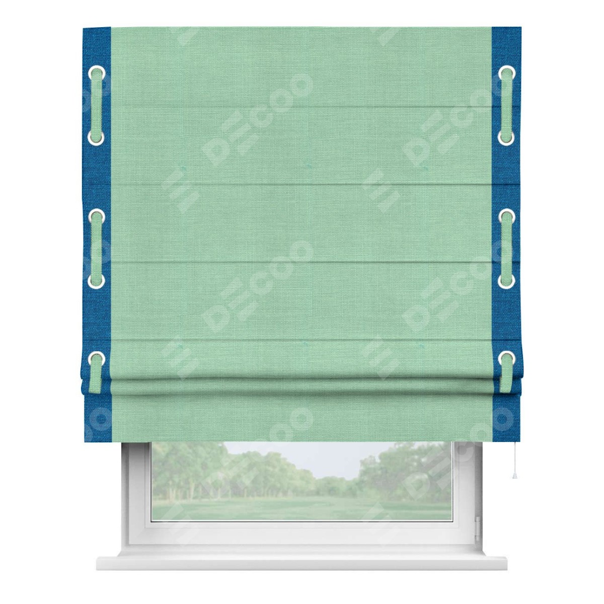 Римская штора производителя «Cortin», используется для проёма, пошита из ткани лён светло-бирюзовый, артикул 74737. Отделка шторы кантом «Стрим Дуо» на кантах расположены люверсы с пояском, ткань для канта используется из льна разной расцветки на выбор. Ткань для пояска обычно используется из основной ткани шторы, а так же можно сделать из любой расцветки по желанию. Имеет универсальный механизм и подходит для монтажа: на потолок, на стену и в нишу.