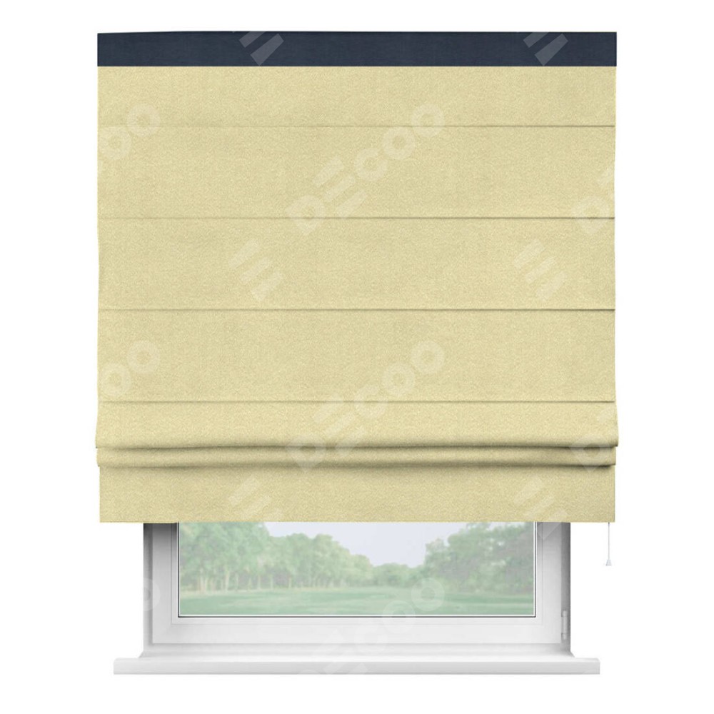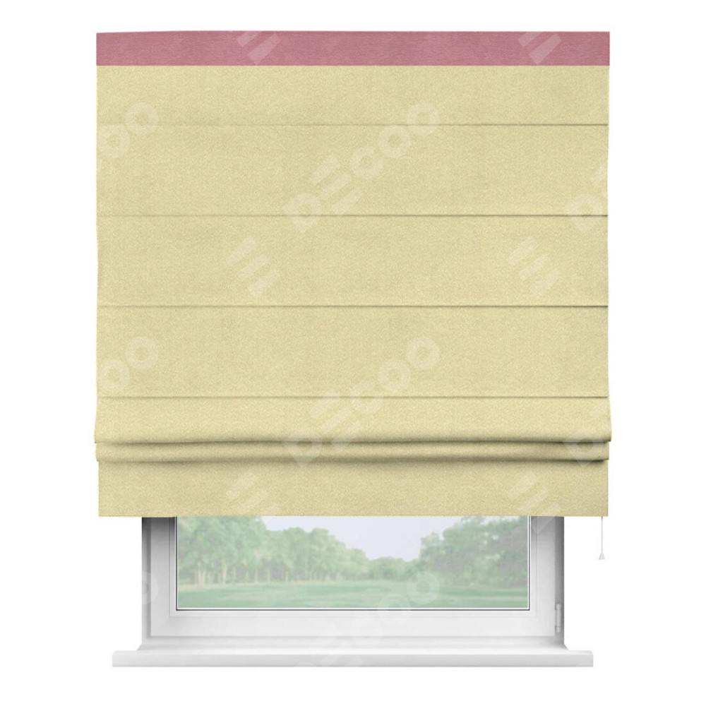 Римская штора производителя «Cortin», используется для проёма, пошита из ткани софт однотонный молочный, артикул 11938. Отделка шторы кантом «Кинг», ткань для канта используется из софта разной расцветки на выбор. Имеет универсальный механизм и подходит для монтажа: на потолок, на стену и в нишу.