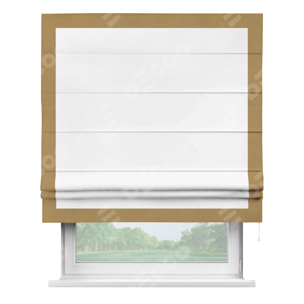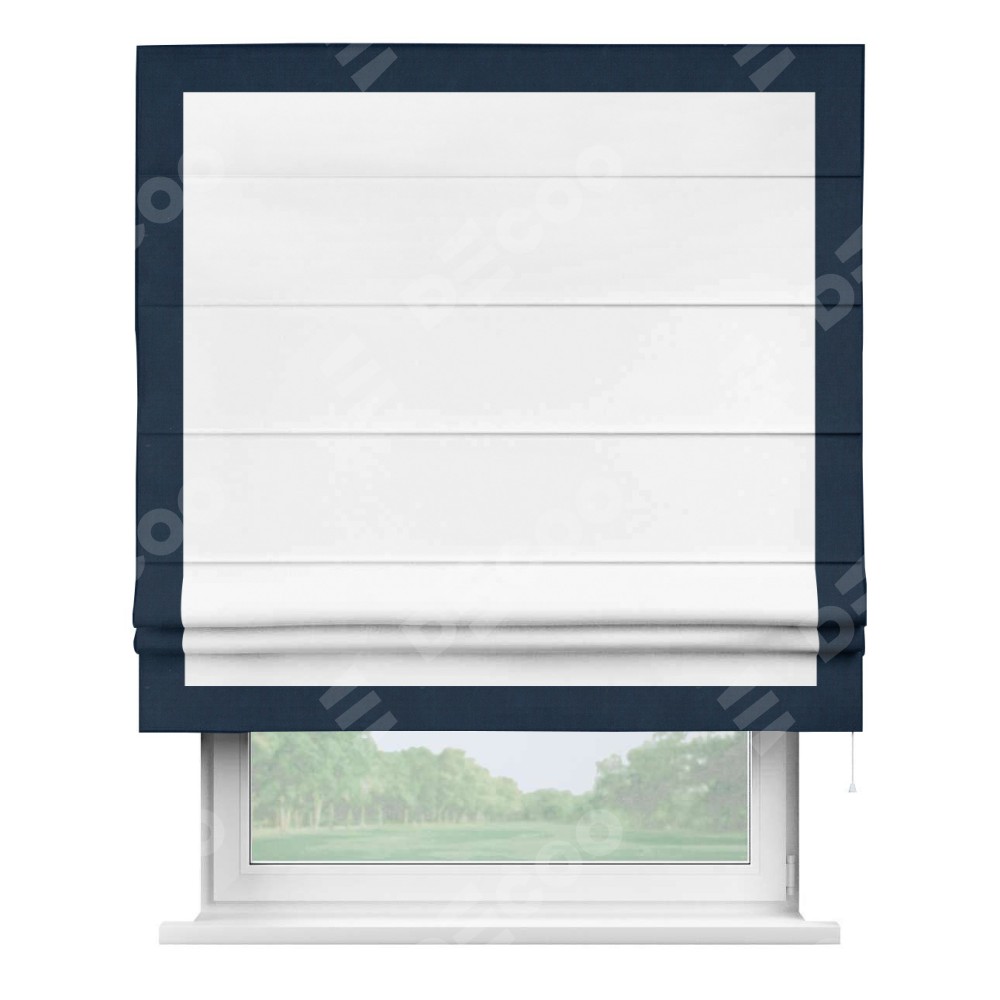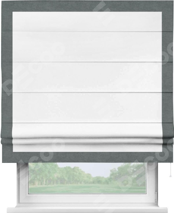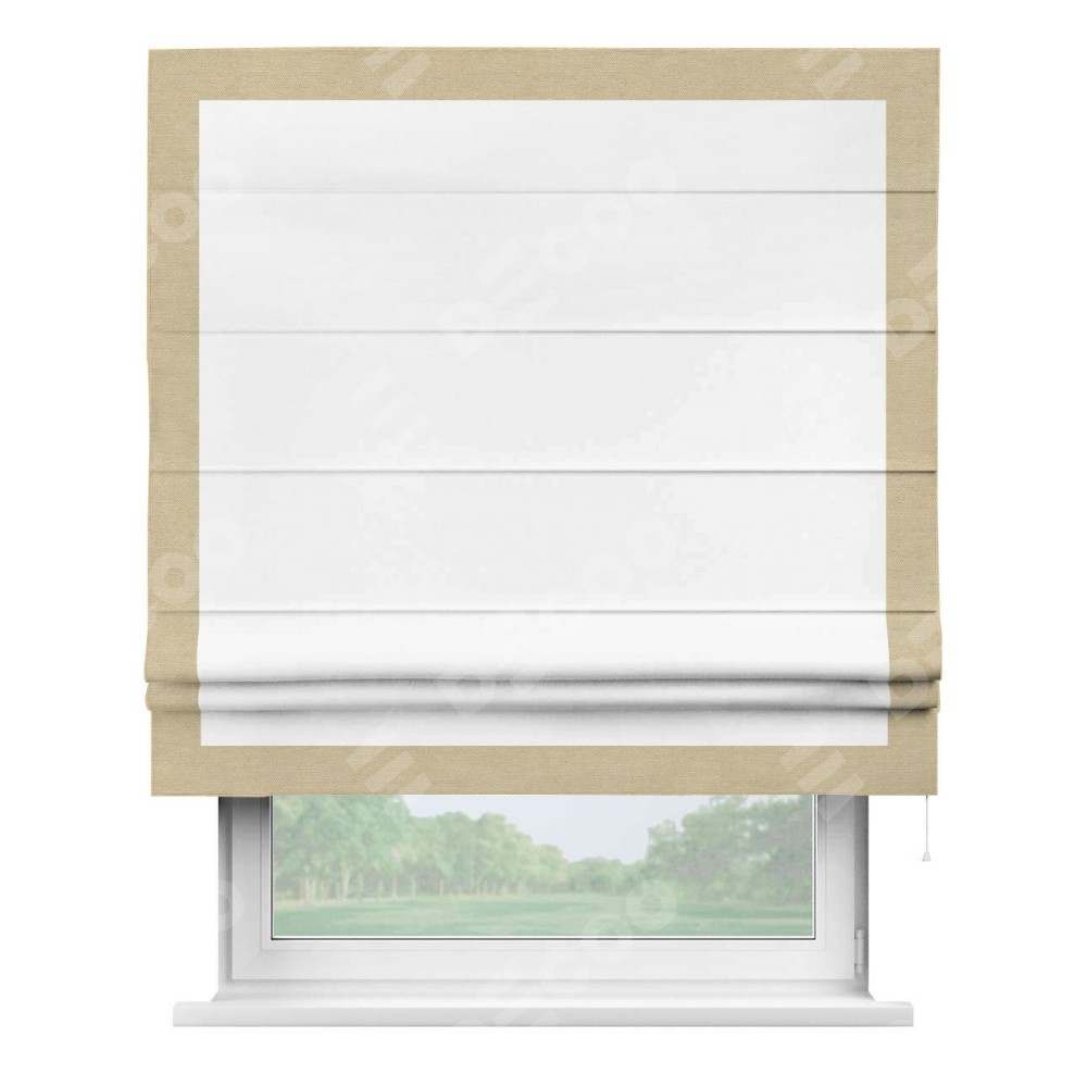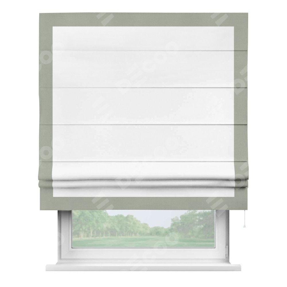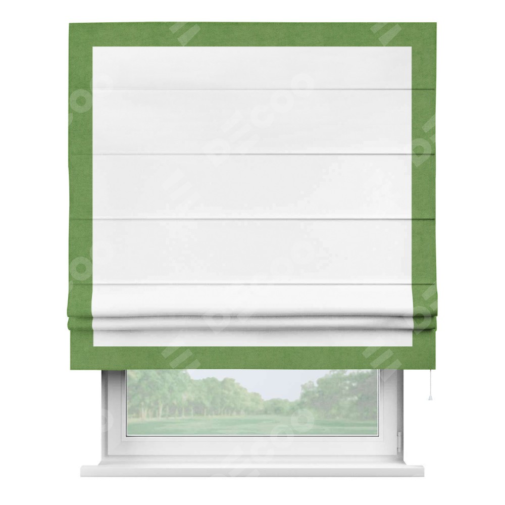 Римская штора производителя «Cortin», используется для проёма, пошита из ткани вельвет белоснежный, артикул ткани 19192. Отделка шторы кантом «Чесс», ткань для канта используется из вельвета разной расцветки на выбор. Имеет универсальный механизм и подходит для монтажа: на потолок, на стену и в нишу.