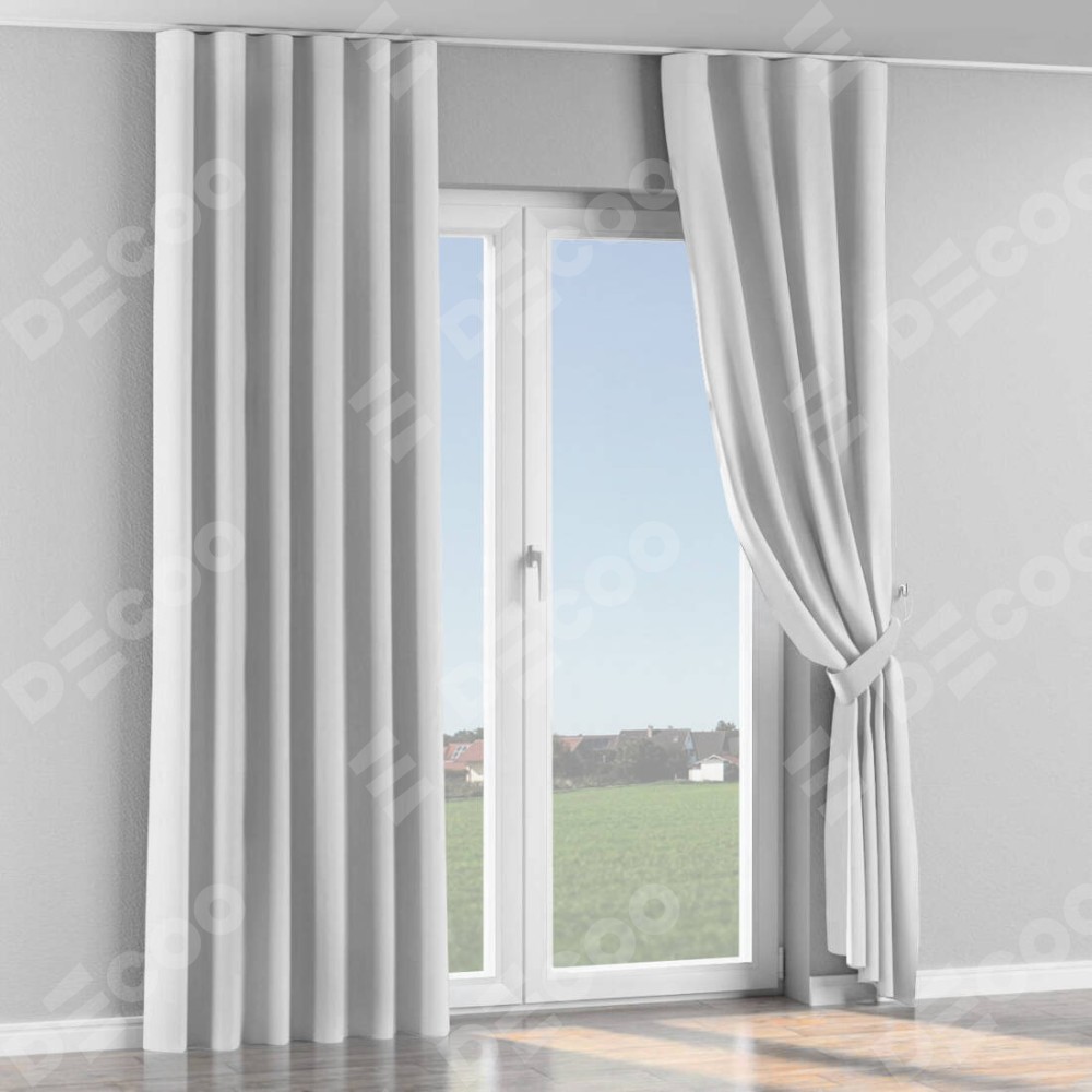 Комплект прямых штор, от производителя «Cortin», пошиты из ткани лён белый, артикул ткани 7439. С изнаночной стороны в верхней части штор пристрачивается шторная лента с декоративными складками «Волна». Для создания элегантных складок прямые шторы шьются по стандарту с коэффициентом 1:2 (на 100 см. ширины проёма 200 см. ширины ткани).