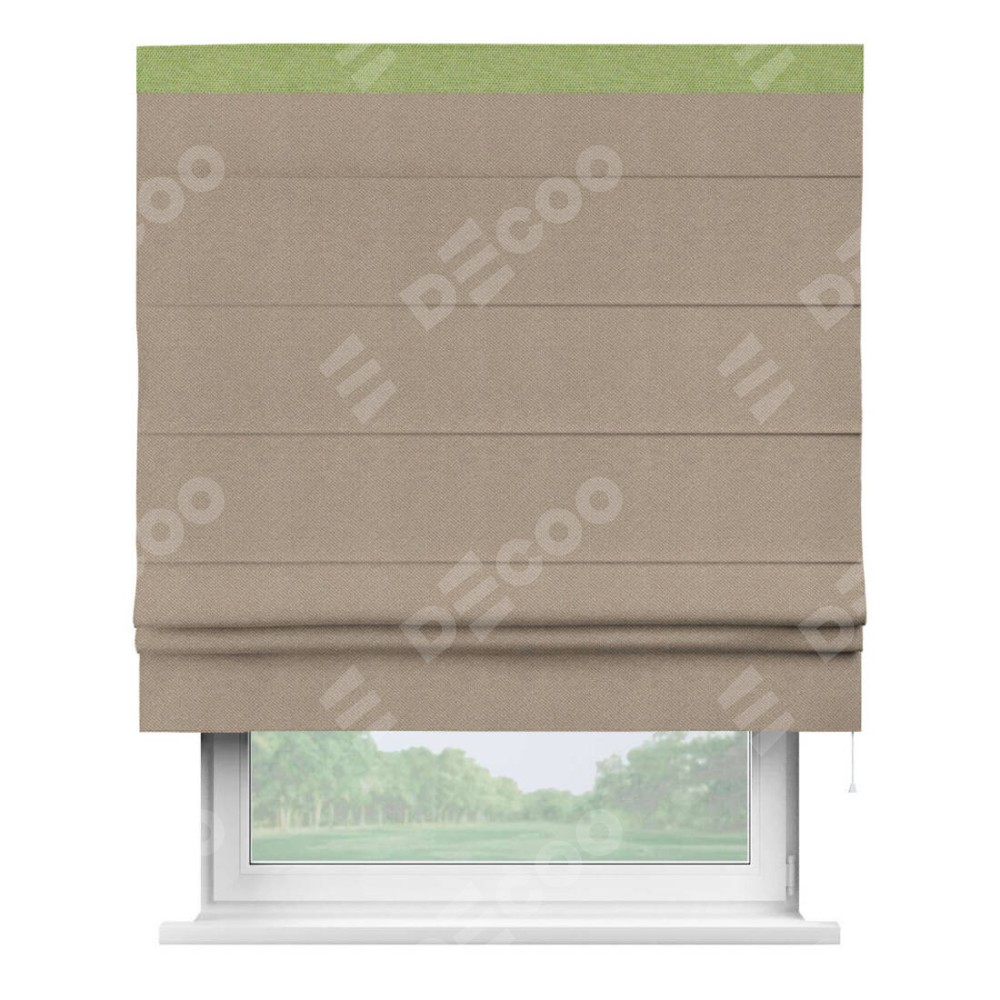 Римская штора производителя «Cortin», используется для проёма, пошита из ткани лён димаут светло-бежевый, артикул 00002. Отделка шторы кантом «Кинг», ткань для канта используется из льна димаут разной расцветки на выбор. Имеет универсальный механизм и подходит для монтажа: на потолок, на стену и в нишу.