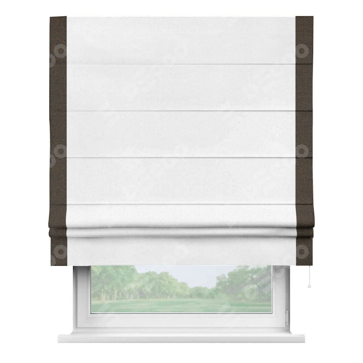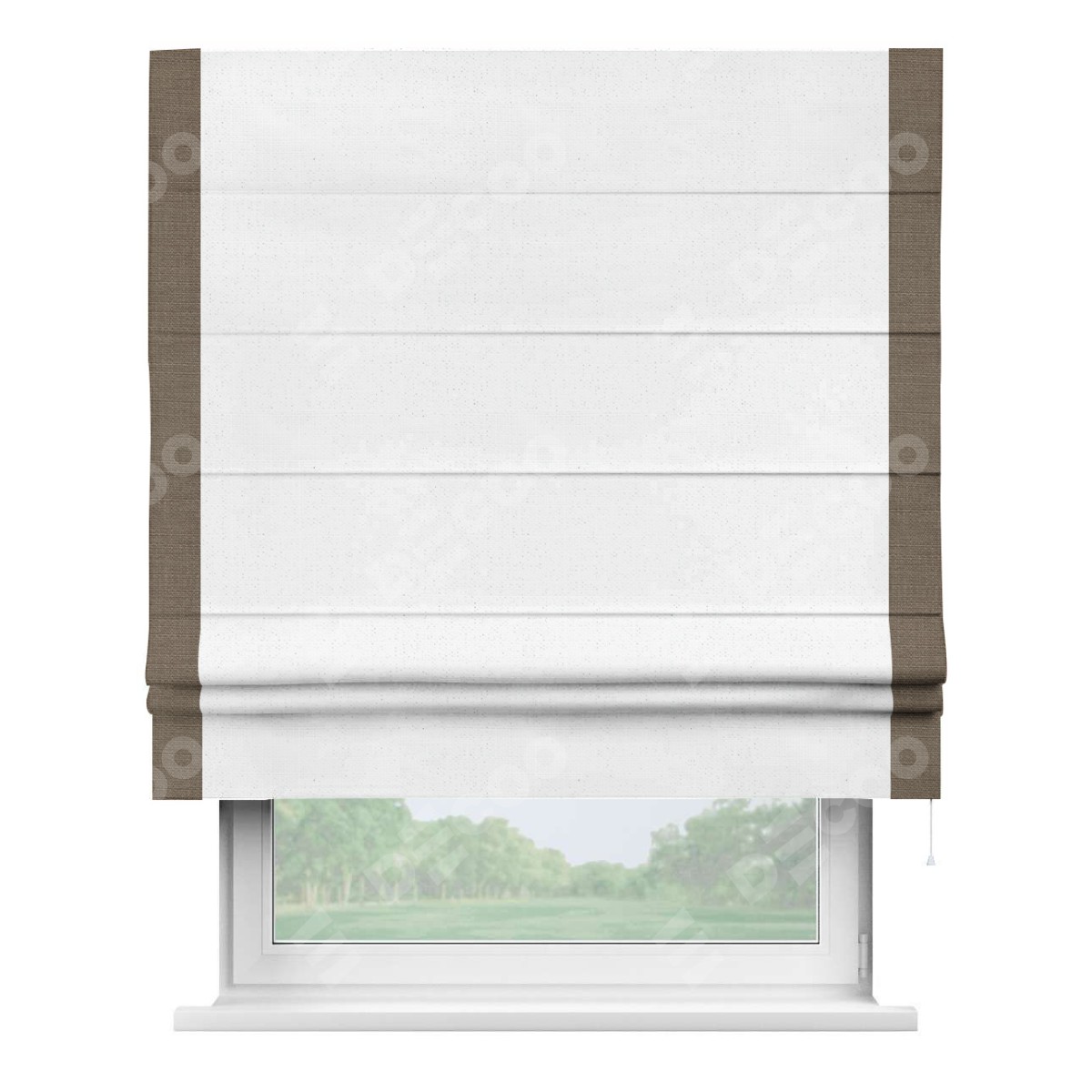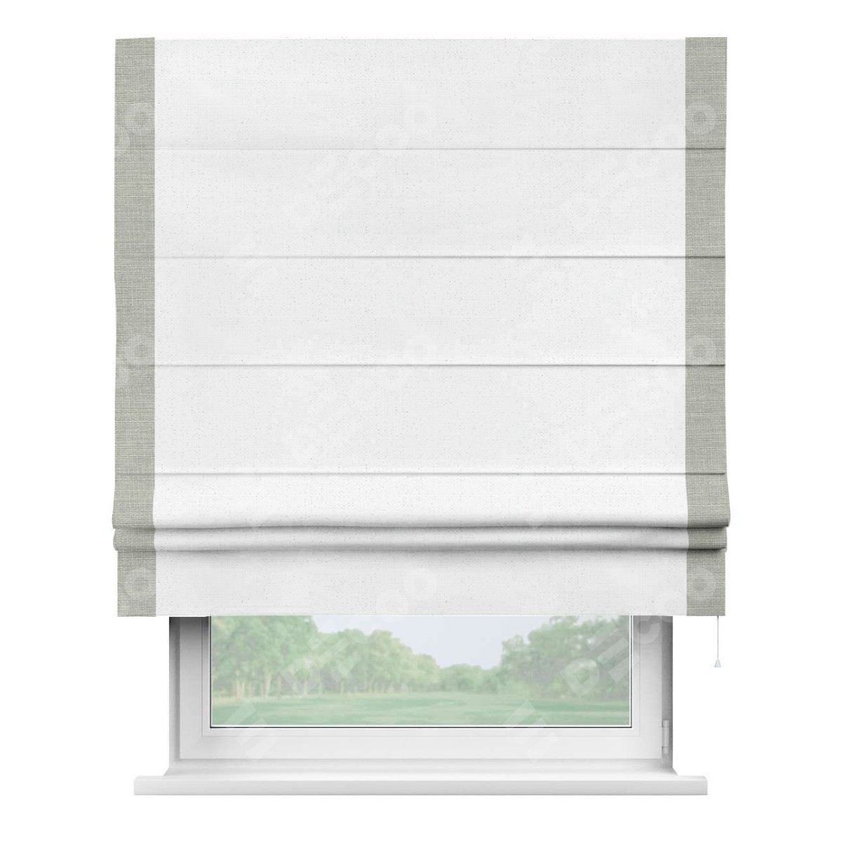 Римская штора производителя «Cortin», используется для проёма, пошита из ткани лён белый, артикул 7439. Отделка шторы кантом «Стрим Дуо», ткань для канта используется из льна разной расцветки на выбор. Имеет универсальный механизм и подходит для монтажа: на потолок, на стену и в нишу.