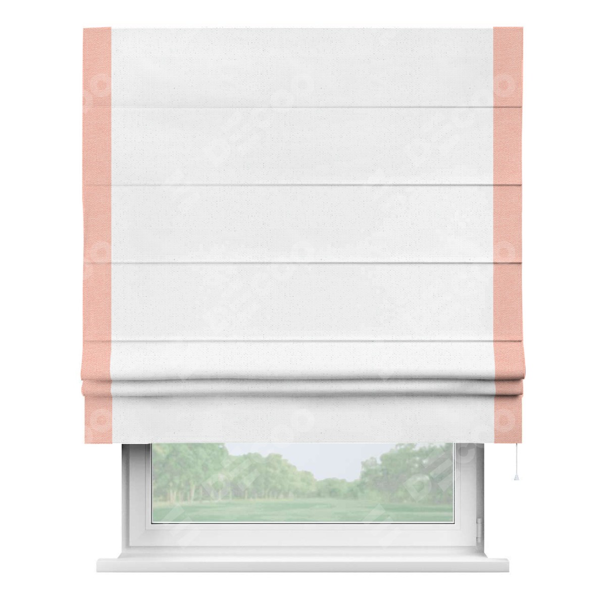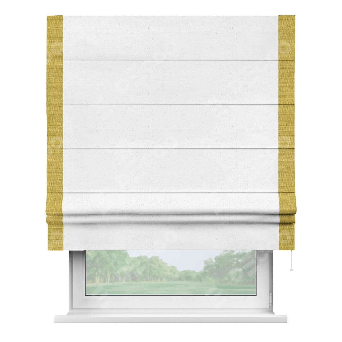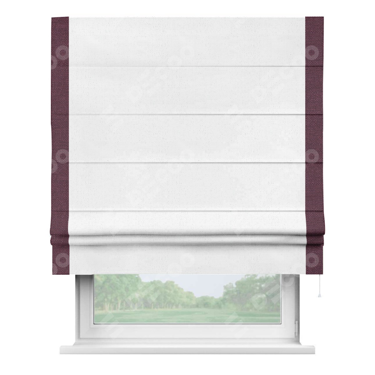 Римская штора производителя «Cortin», используется для проёма, пошита из ткани лён белый, артикул 7439. Отделка шторы кантом «Стрим Дуо», ткань для канта используется из льна разной расцветки на выбор. Имеет универсальный механизм и подходит для монтажа: на потолок, на стену и в нишу.