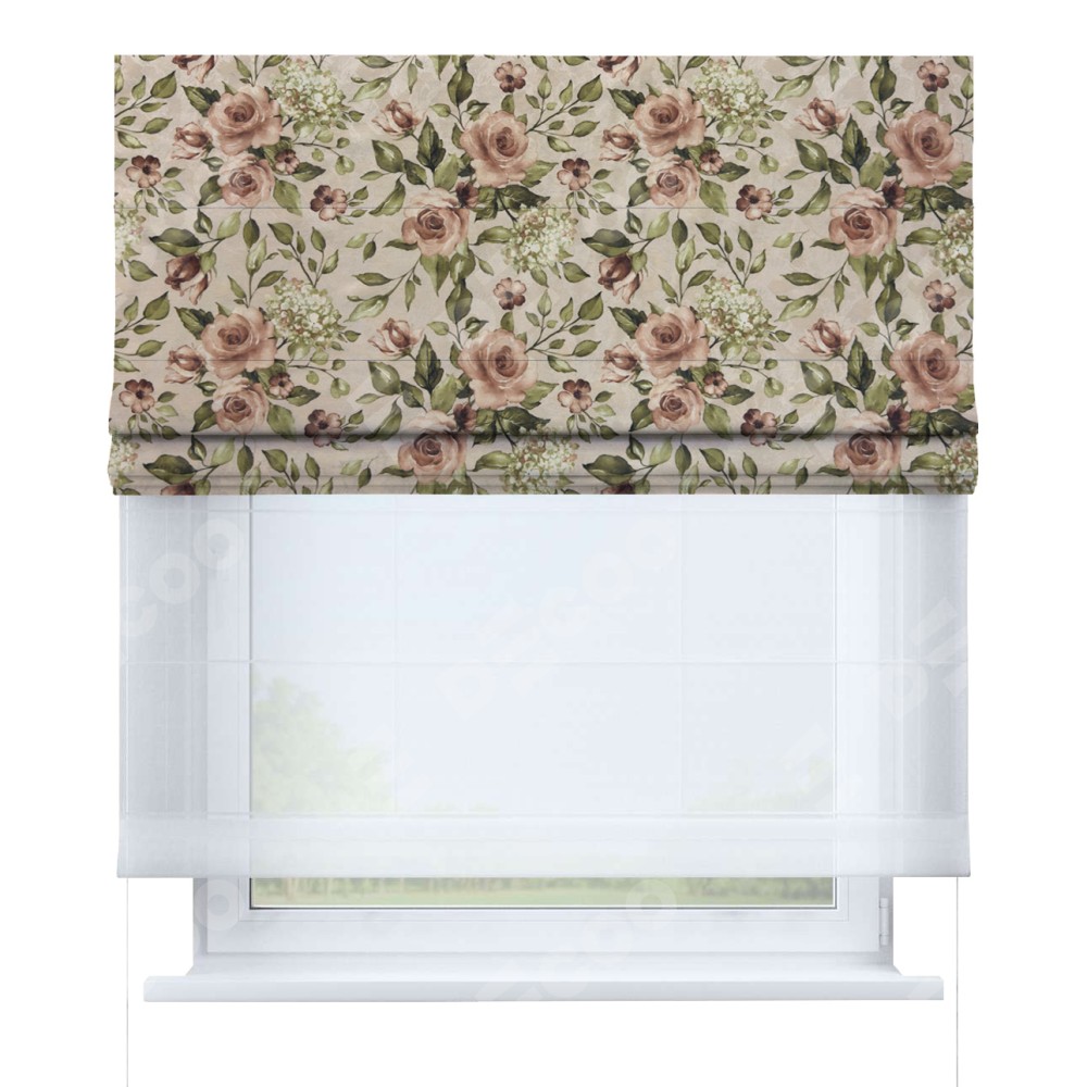 Римская штора день-ночь производителя «Cortin», используется для проёма, пошита из двух полотен, с лицевой стороны «Розы бежевые» артикул 34564, вторая ткань тюль (по стандарту комплектуется тюль белого цвета артикул V-01). Имеет универсальный механизм и подходит для монтажа: на потолок, на стену и в нишу.