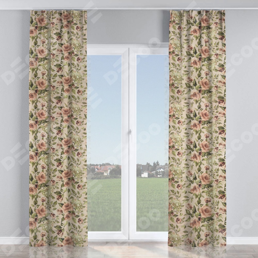Комплект прямых штор, от производителя «Cortin», пошиты из ткани «Розы бежевые», артикул ткани 34564. С изнаночной стороны в верхней части штор пристрачивается шторная лента с декоративными складками «Кустик». Для создания элегантных складок прямые шторы шьются по стандарту с коэффициентом 1:2 (на 100 см. ширины проёма 200 см. ширины ткани).