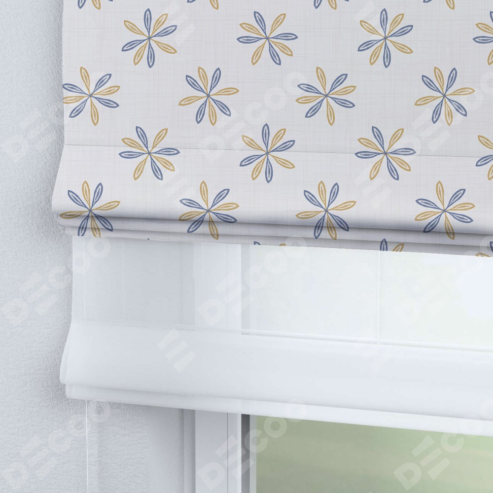 Римская штора день-ночь производителя «Cortin», используется для проёма, пошита из двух полотен, с лицевой блэкаут с нанесением сублимационной печати «Ромашки кантри», вторая ткань тюль (по стандарту комплектуется тюль белого цвета артикул V-01). Имеет универсальный механизм и подходит для монтажа: на потолок, на стену и в нишу.