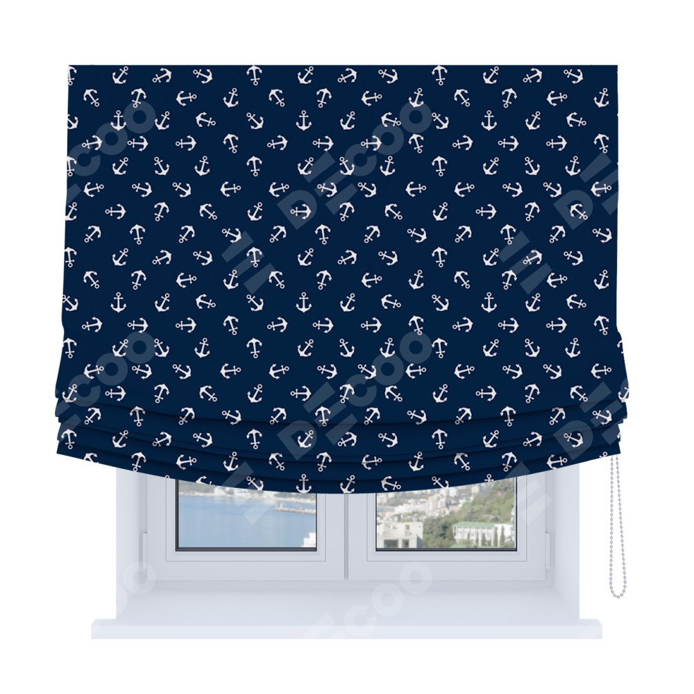 Римская штора Soft производителя «Cortin», используется для проёма, пошита из ткани блэкаут с нанесением сублимационной печати «Морские якори». Имеет универсальный механизм и подходит для монтажа: на потолок, на стену и в нишу. В отличие от стандартных римских штор, римская штора Soft не имеет горизонтальных вставок и нижнего отвеса. Это позволяет ткани произвольно драпироваться в свободные мягкие складки.