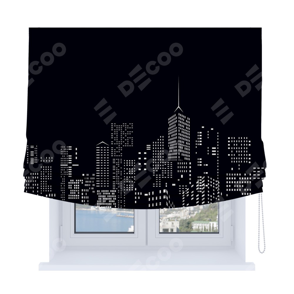Римская штора Soft производителя «Cortin», используется для проёма, пошита из ткани блэкаут с нанесением сублимационной печати «Ночной город». Имеет универсальный механизм и подходит для монтажа: на потолок, на стену и в нишу. В отличие от стандартных римских штор, римская штора Soft не имеет горизонтальных вставок и нижнего отвеса. Это позволяет ткани произвольно драпироваться в свободные мягкие складки.