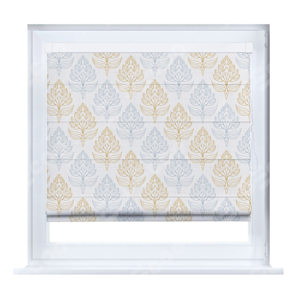 Римская штора кассетного типа, производителя «Cortin», устанавливается только на пластиковые окна и прилегает к стеклопакету, пошита из ткани блэкаут с нанесением сублимационной печати «Цветочный медальон».