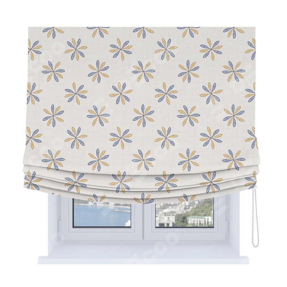 Римская штора Soft производителя «Cortin», используется для проёма, пошита из ткани блэкаут с нанесением сублимационной печати «Ромашки кантри». Имеет универсальный механизм и подходит для монтажа: на потолок, на стену и в нишу. В отличие от стандартных римских штор, римская штора Soft не имеет горизонтальных вставок и нижнего отвеса. Это позволяет ткани произвольно драпироваться в свободные мягкие складки.