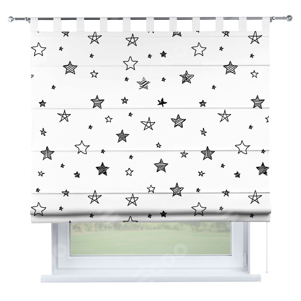 Римская штора производителя «Cortin», используется для проёма, пошита из ткани блэкаут с нанесением сублимационной печати «Звезды». Данная модель пошита на петлях, комплектуется на выбор круглым карнизом и подходит для монтажа на стену. Римская штора на петлях имеет простую систему регулировки высоты, отличительным преимуществом данной модели является простой способ монтажа. Достаточно повесить ее на трубу и штора готова!