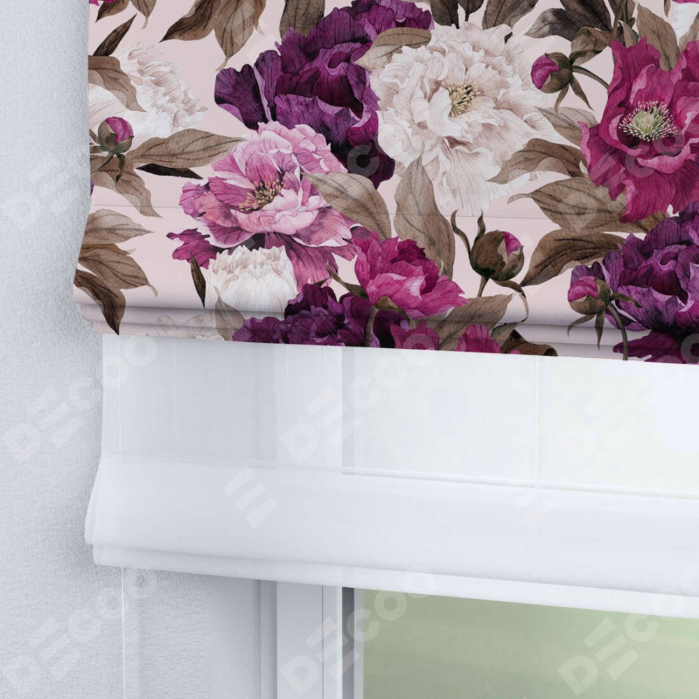 Римская штора день-ночь производителя «Cortin», используется для проёма, пошита из двух полотен, с лицевой блэкаут с нанесением сублимационной печати «Великолепные пионы», вторая ткань тюль (по стандарту комплектуется тюль белого цвета артикул V-01). Имеет универсальный механизм и подходит для монтажа: на потолок, на стену и в нишу.