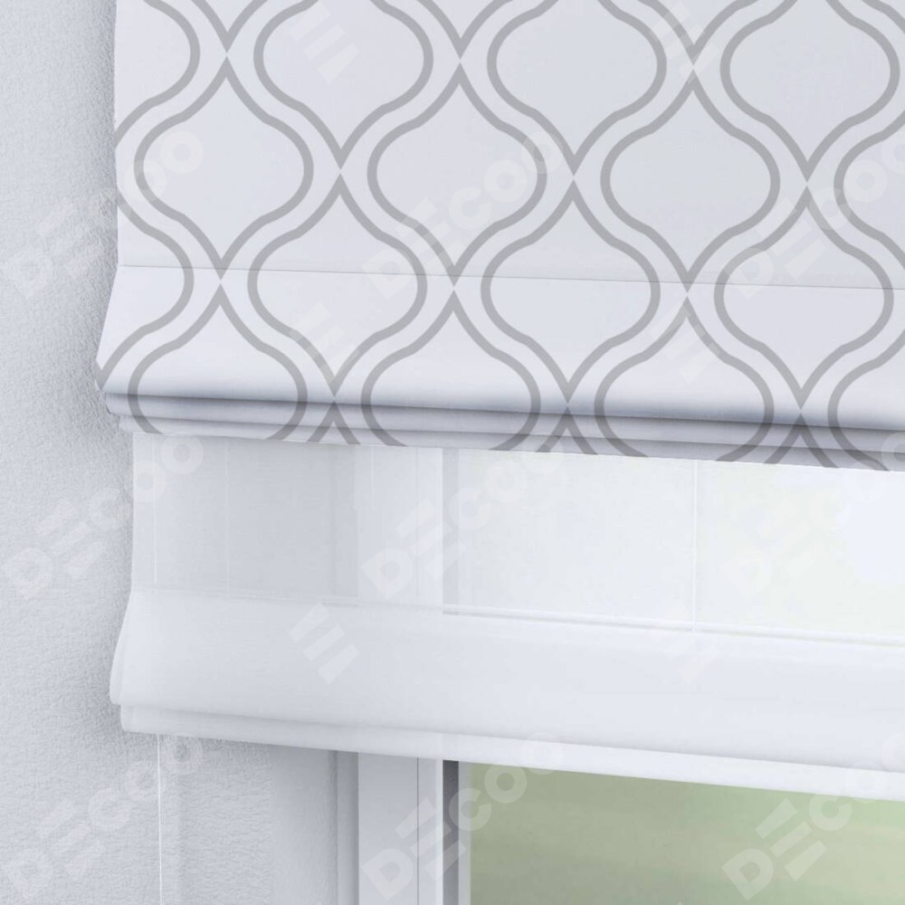 Римская штора день-ночь производителя «Cortin», используется для проёма, пошита из двух полотен, с лицевой блэкаут с нанесением сублимационной печати «Тайны востока белый», вторая ткань тюль (по стандарту комплектуется тюль белого цвета артикул V-01). Имеет универсальный механизм и подходит для монтажа: на потолок, на стену и в нишу.