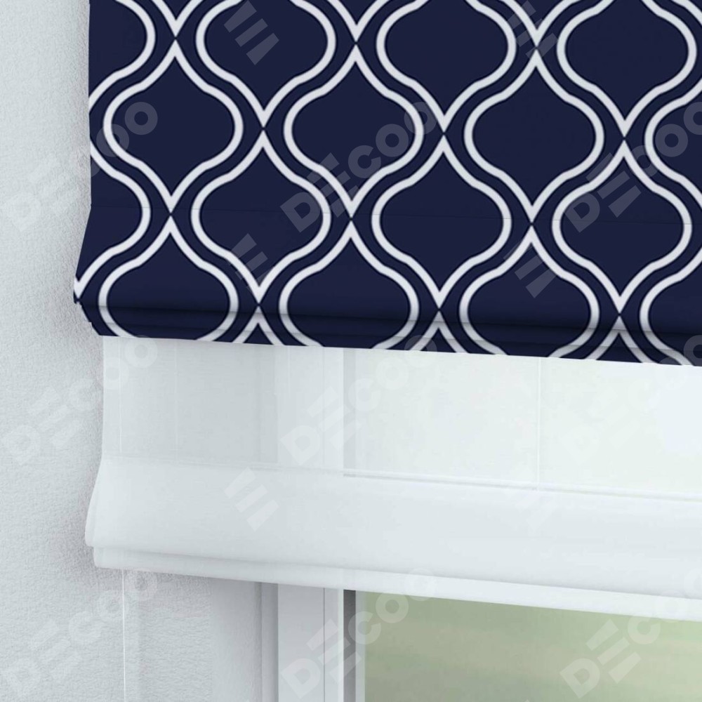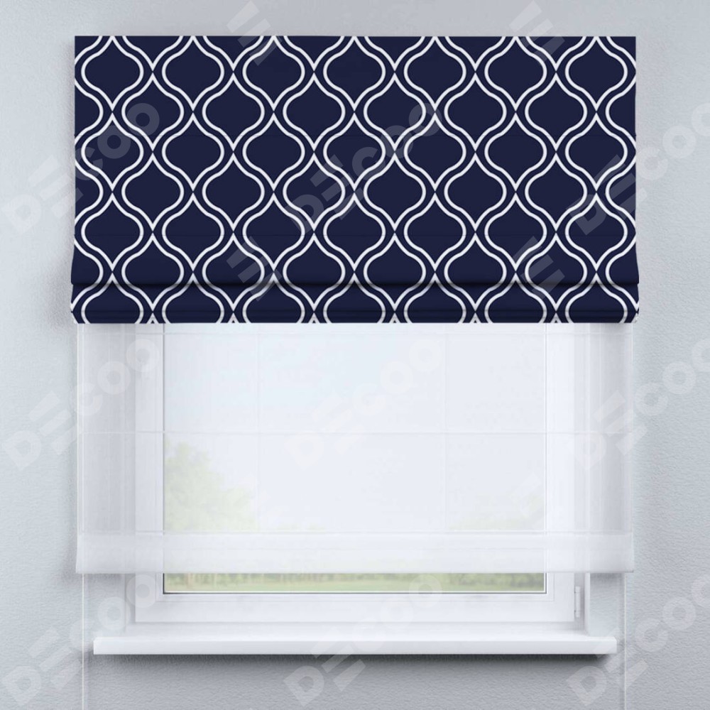 Римская штора день-ночь производителя «Cortin», используется для проёма, пошита из двух полотен, с лицевой блэкаут с нанесением сублимационной печати «Тайны востока синий», вторая ткань тюль (по стандарту комплектуется тюль белого цвета артикул V-01). Имеет универсальный механизм и подходит для монтажа: на потолок, на стену и в нишу.