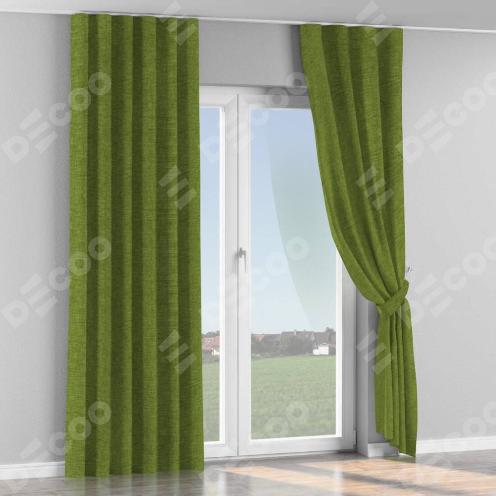Комплект прямых штор, от производителя «Cortin», пошиты из ткани рогожка димаут салатовый, артикул ткани 80423. С изнаночной стороны в верхней части штор пристрачивается шторная лента с декоративными складками «Волна». Для создания элегантных складок прямые шторы шьются по стандарту с коэффициентом 1:2 (на 100 см. ширины проёма 200 см. ширины ткани).
