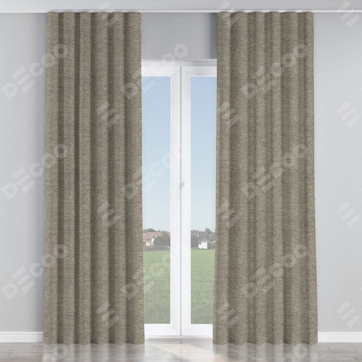 Комплект прямых штор, от производителя «Cortin», пошиты из ткани стиф димаут серо-коричневый, артикул ткани 44028. С изнаночной стороны в верхней части штор пристрачивается шторная лента с декоративными складками «Волна». Для создания элегантных складок прямые шторы шьются по стандарту с коэффициентом 1:2 (на 100 см. ширины проёма 200 см. ширины ткани).