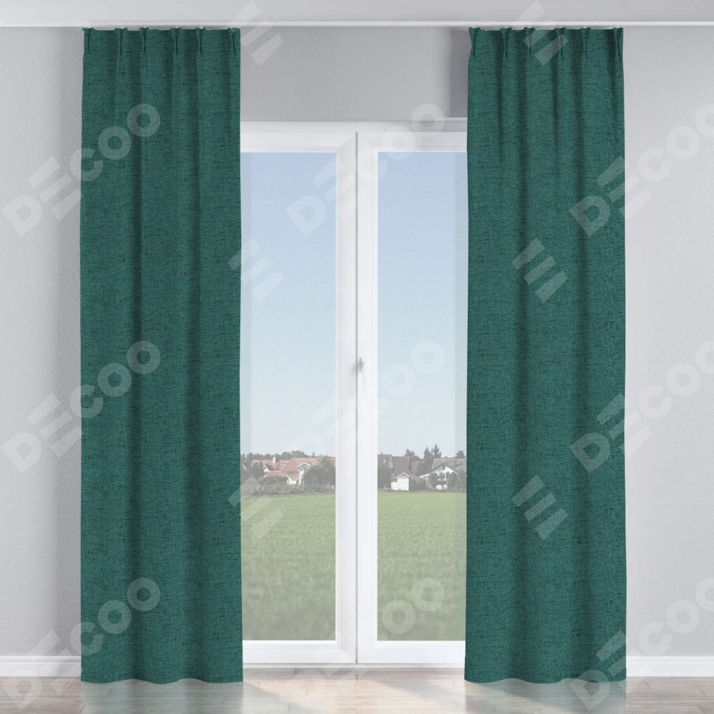 Комплект прямых штор, от производителя «Cortin», пошиты из ткани стиф димаут сине-зелёный, артикул ткани 18194. С изнаночной стороны в верхней части штор пристрачивается шторная лента с декоративными складками «Кустик». Для создания элегантных складок прямые шторы шьются по стандарту с коэффициентом 1:2 (на 100 см. ширины проёма 200 см. ширины ткани).