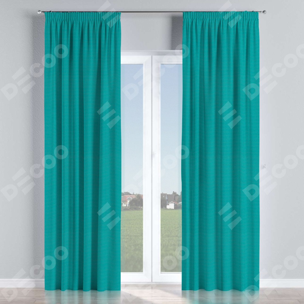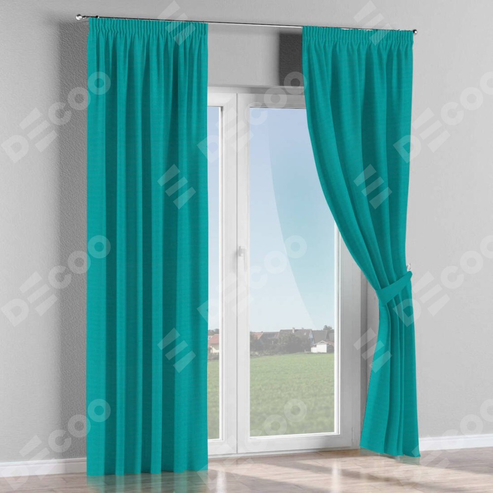 Комплект прямых штор, от производителя «Cortin», пошиты из ткани блэкаут однотонный бирюзовый, артикул ткани 88297. С изнаночной стороны в верхней части штор пристрачивается шторная лента с декоративными складками «Карандаш». Для создания элегантных складок прямые шторы шьются по стандарту с коэффициентом 1:2 (на 100 см. ширины проёма 200 см. ширины ткани).