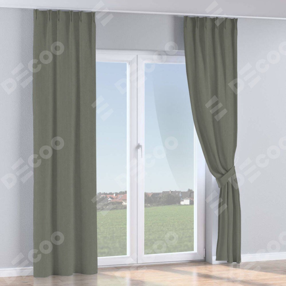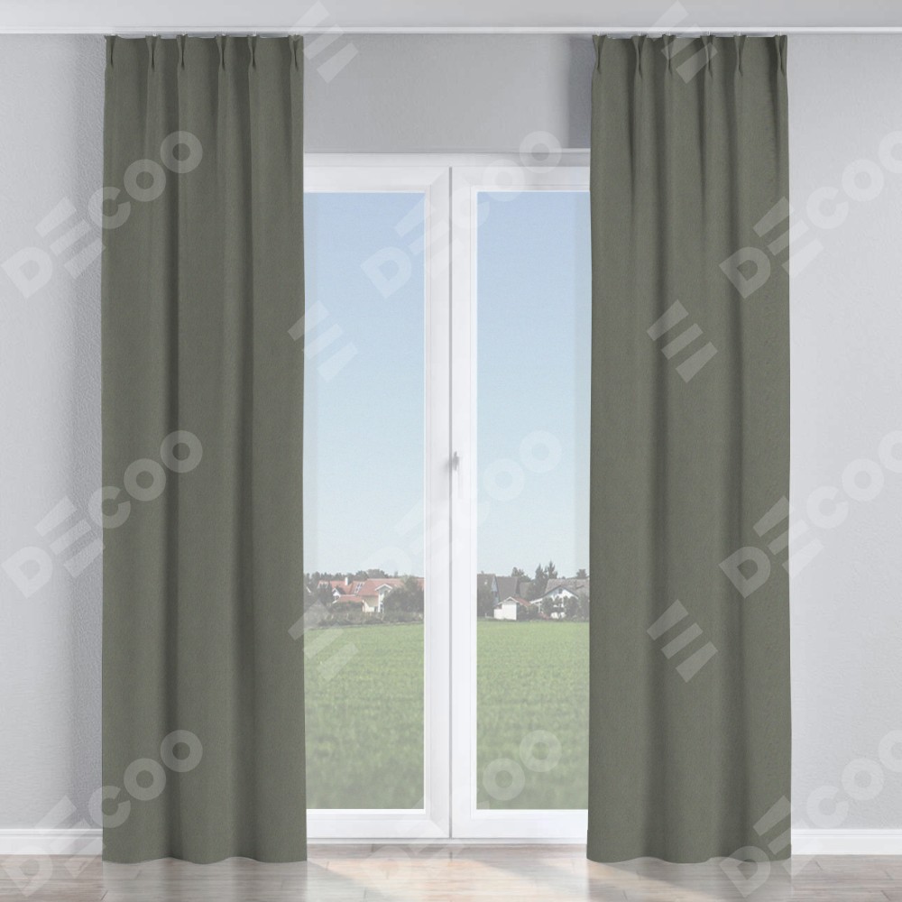 Комплект прямых штор, от производителя «Cortin», пошиты из ткани блэкаут однотонный тёмно-серый, артикул ткани 29332−1. С изнаночной стороны в верхней части штор пристрачивается шторная лента с декоративными складками «Кустик». Для создания элегантных складок прямые шторы шьются по стандарту с коэффициентом 1:2 (на 100 см. ширины проёма 200 см. ширины ткани).