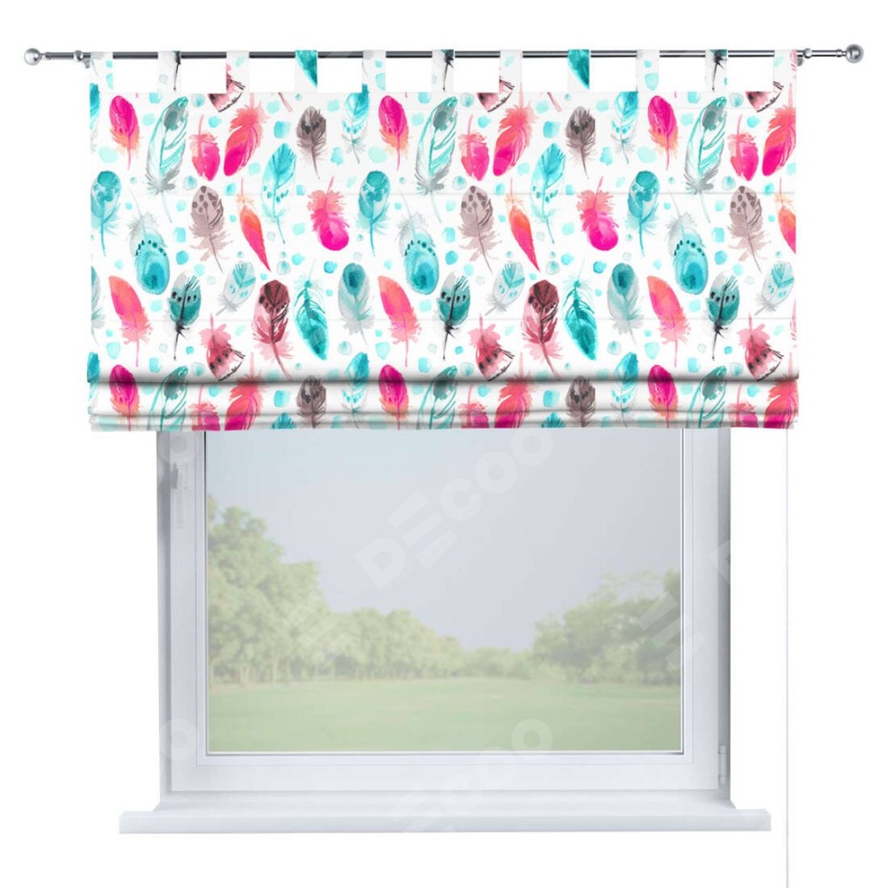 Римская штора производителя «Cortin», используется для проёма, пошита из ткани блэкаут с нанесением сублимационной печати «Перья». Данная модель пошита на петлях, комплектуется на выбор круглым карнизом и подходит для монтажа на стену. Римская штора на петлях имеет простую систему регулировки высоты, отличительным преимуществом данной модели является простой способ монтажа. Достаточно повесить ее на трубу и штора готова!
