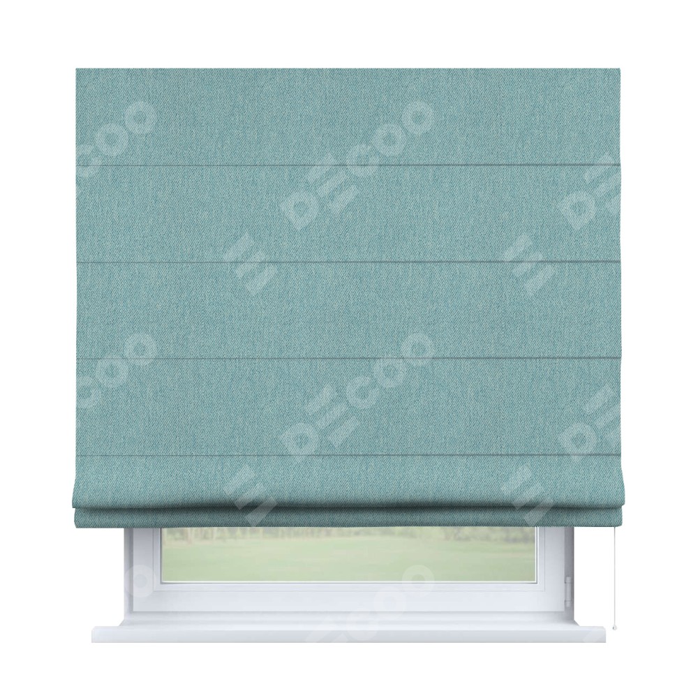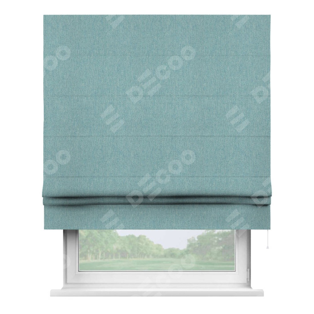 Римская штора производителя «Cortin», используется для проёма, пошита из ткани твид блэкаут небесно-голубой, артикул ткани 21578. Имеет универсальный механизм и подходит для монтажа: на потолок, на стену и в нишу.