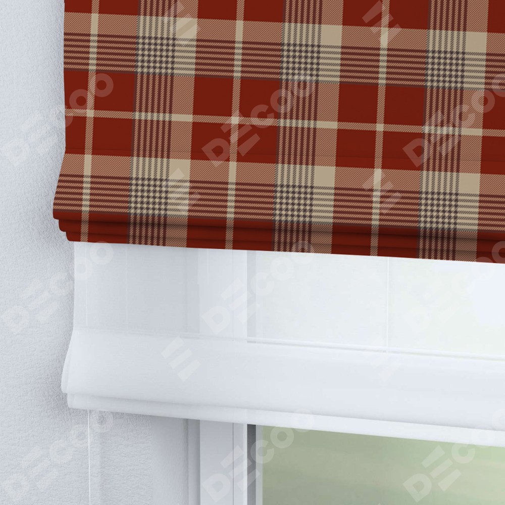 Римская штора день-ночь производителя «Cortin», используется для проёма, пошита из двух полотен, с лицевой блэкаут с нанесением сублимационной печати «Бежево-бордовая клетка», вторая ткань тюль (по стандарту комплектуется тюль белого цвета артикул V-01). Имеет универсальный механизм и подходит для монтажа: на потолок, на стену и в нишу.