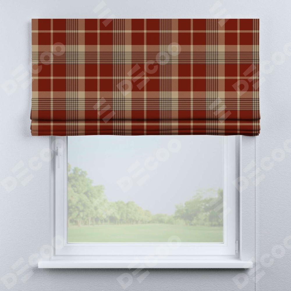 Римская штора производителя «Cortin», используется для проёма, пошита из ткани блэкаут с нанесением сублимационной печати «Бежево-бордовая клетка». Имеет универсальный механизм и подходит для монтажа: на потолок, на стену и в нишу.