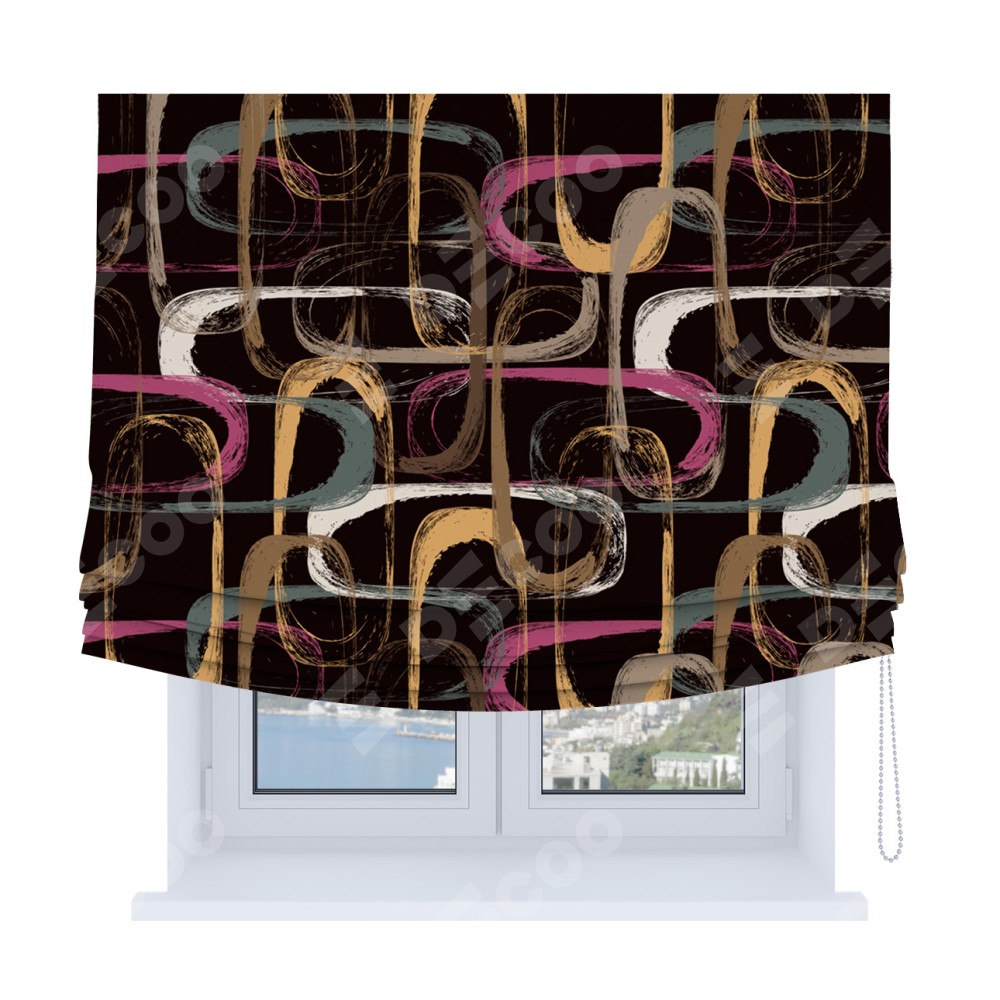 Римская штора Soft производителя «Cortin», используется для проёма, пошита из ткани блэкаут с нанесением сублимационной печати «Тёмная палитра». Имеет универсальный механизм и подходит для монтажа: на потолок, на стену и в нишу. В отличие от стандартных римских штор, римская штора Soft не имеет горизонтальных вставок и нижнего отвеса. Это позволяет ткани произвольно драпироваться в свободные мягкие складки.