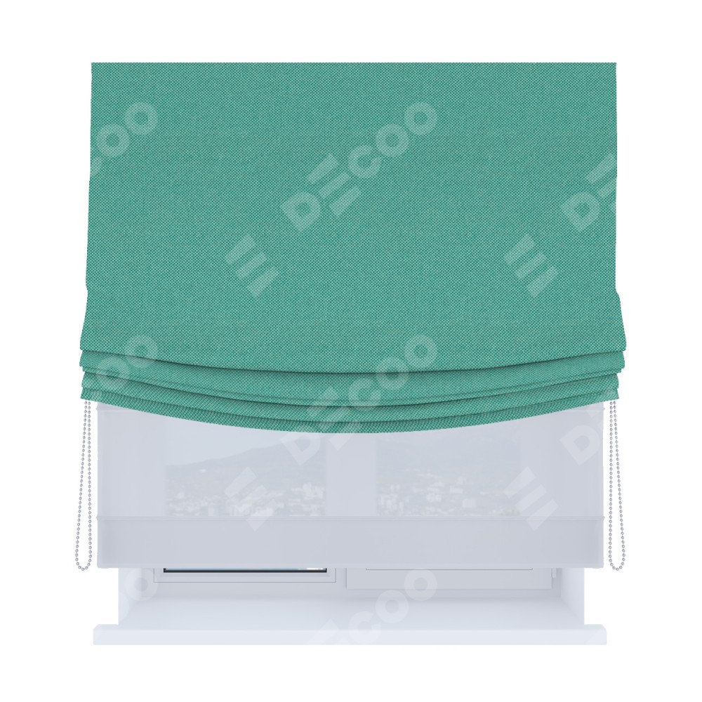 Римская штора день-ночь производителя «Cortin», используется для проёма, пошита из двух полотен, с лицевой стороны лён димаут бирюзовый артикул 23, вторая ткань тюль (по стандарту комплектуется тюль белого цвета артикул V-01). Имеет универсальный механизм и подходит для монтажа: на потолок, на стену и в нишу. Удобное управление каждой шторой отдельно.