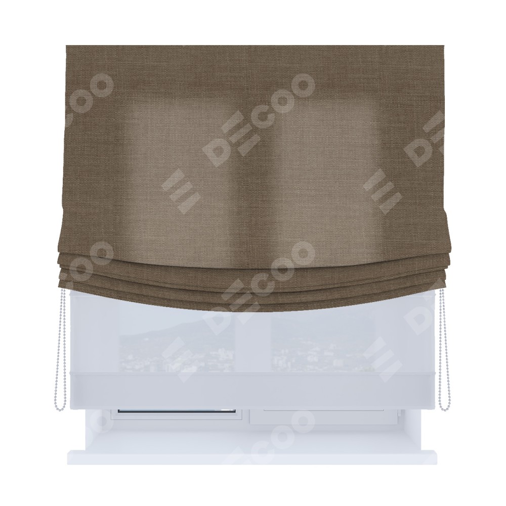 Римская штора день-ночь (двойная) от производителя «Cortin», используется для проёма. Пошита из двух полотен, основная ткань лён мокко артикул 7444, вторая ткань тюль (по стандарту используется тюль белого цвета артикул V-01). Имеет универсальный механизм и подходит для монтажа: на потолок, на стену и в нишу. Удобное управление каждой шторой отдельно.