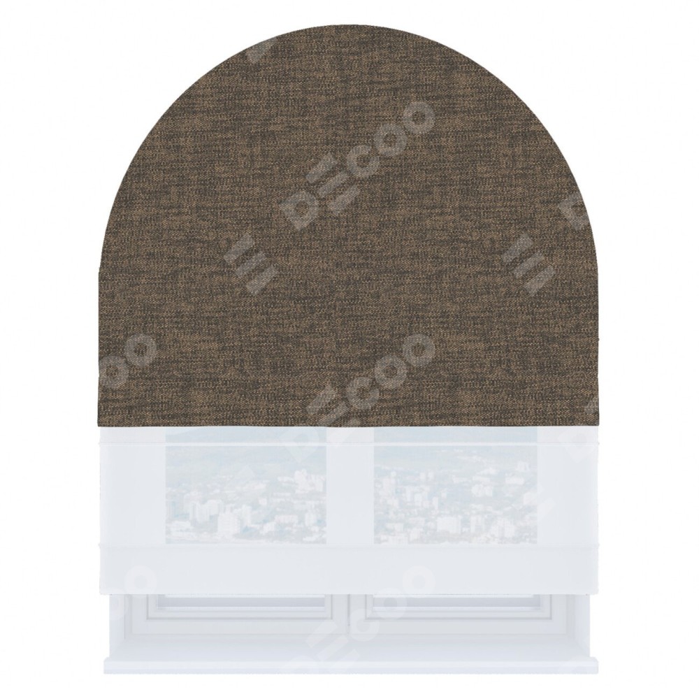 Римская штора день-ночь производителя «Cortin», используется для арочного проёма, пошита из двух полотен, с лицевой стороны рогожка димаут коричневый артикул 80420, вторая ткань тюль (по стандарту комплектуется тюль белого цвета артикул V-01). Штора шьётся по индивидуальным размерам, для данного типа римской шторы возможная ширина от 60 до 300 см. Удобное управление каждой шторой отдельно.