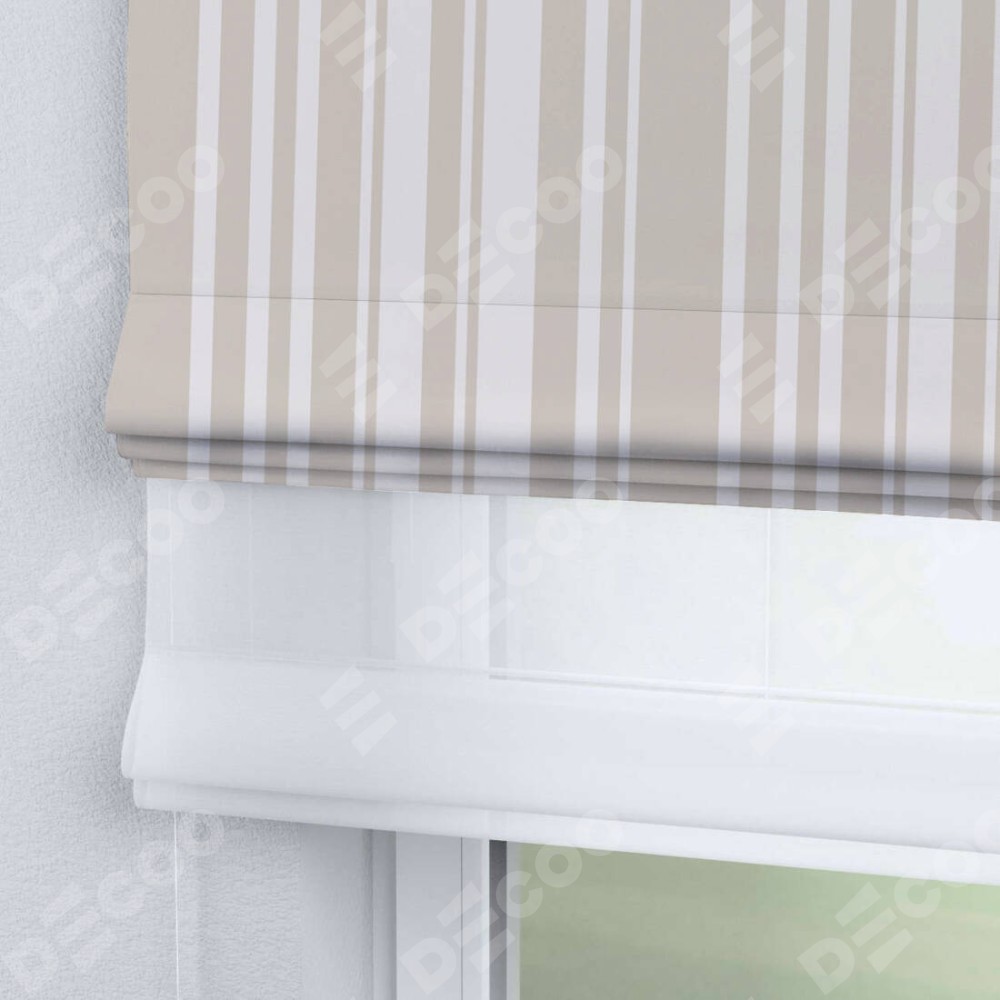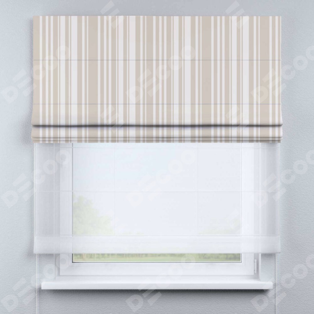 Римская штора день-ночь производителя «Cortin», используется для проёма, пошита из двух полотен, с лицевой блэкаут с нанесением сублимационной печати «Бежевые вертикальные полоски», вторая ткань тюль (по стандарту комплектуется тюль белого цвета артикул V-01). Имеет универсальный механизм и подходит для монтажа: на потолок, на стену и в нишу.
