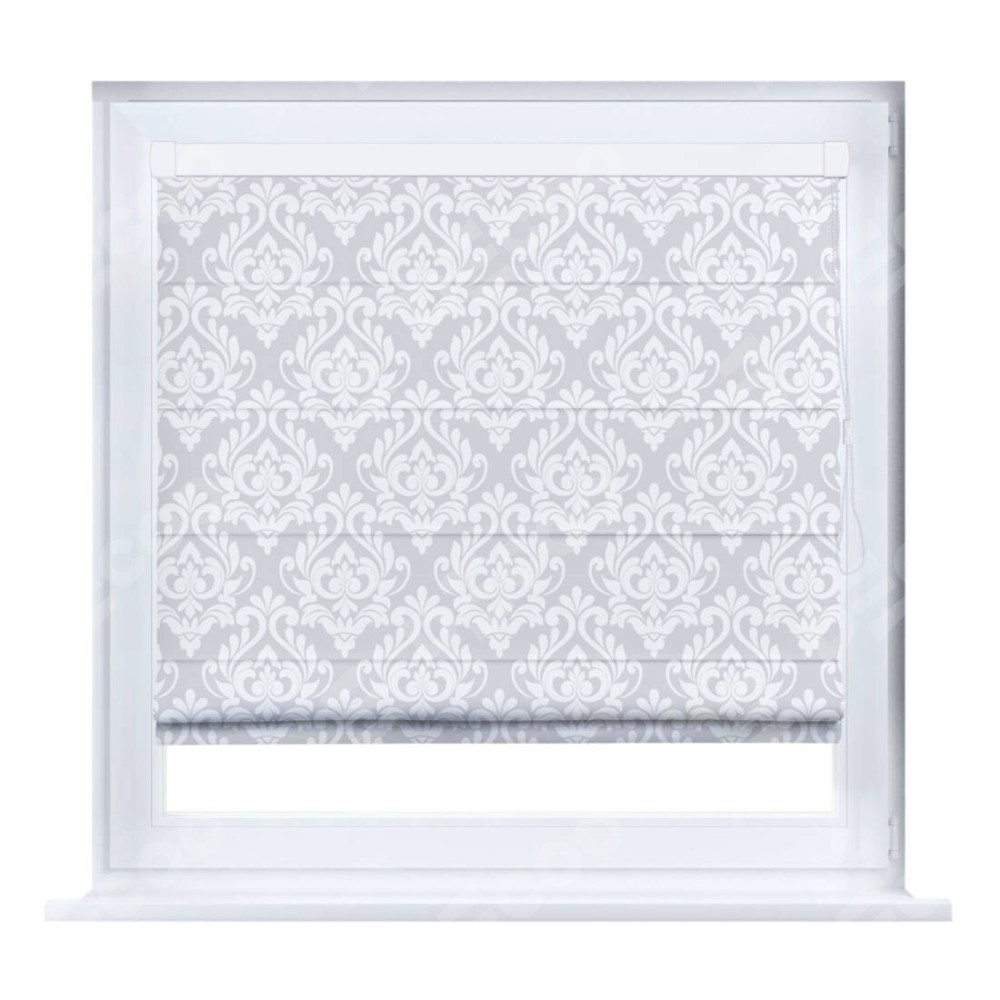 Римская штора производителя «Cortin», устанавливается на створку окна, пошита из ткани блэкаут с нанесением сублимационной печати «Дамаск светлый». Штора шьётся по индивидуальным размерам, для данного типа римской шторы возможная ширина от 35 до 150 см., высота до 250 см.
