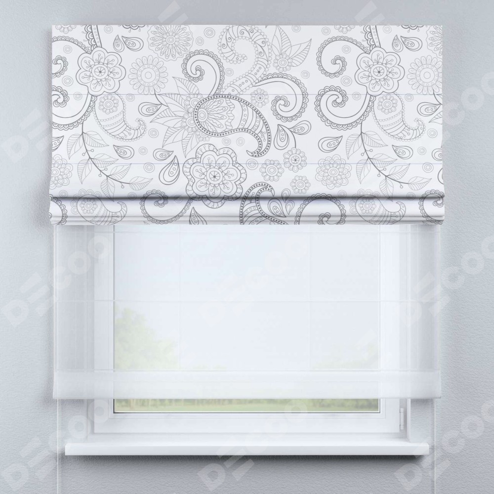 Римская штора день-ночь производителя «Cortin», используется для проёма, пошита из двух полотен, с лицевой блэкаут с нанесением сублимационной печати «Изысканный пейсли», вторая ткань тюль (по стандарту комплектуется тюль белого цвета артикул V-01). Имеет универсальный механизм и подходит для монтажа: на потолок, на стену и в нишу.