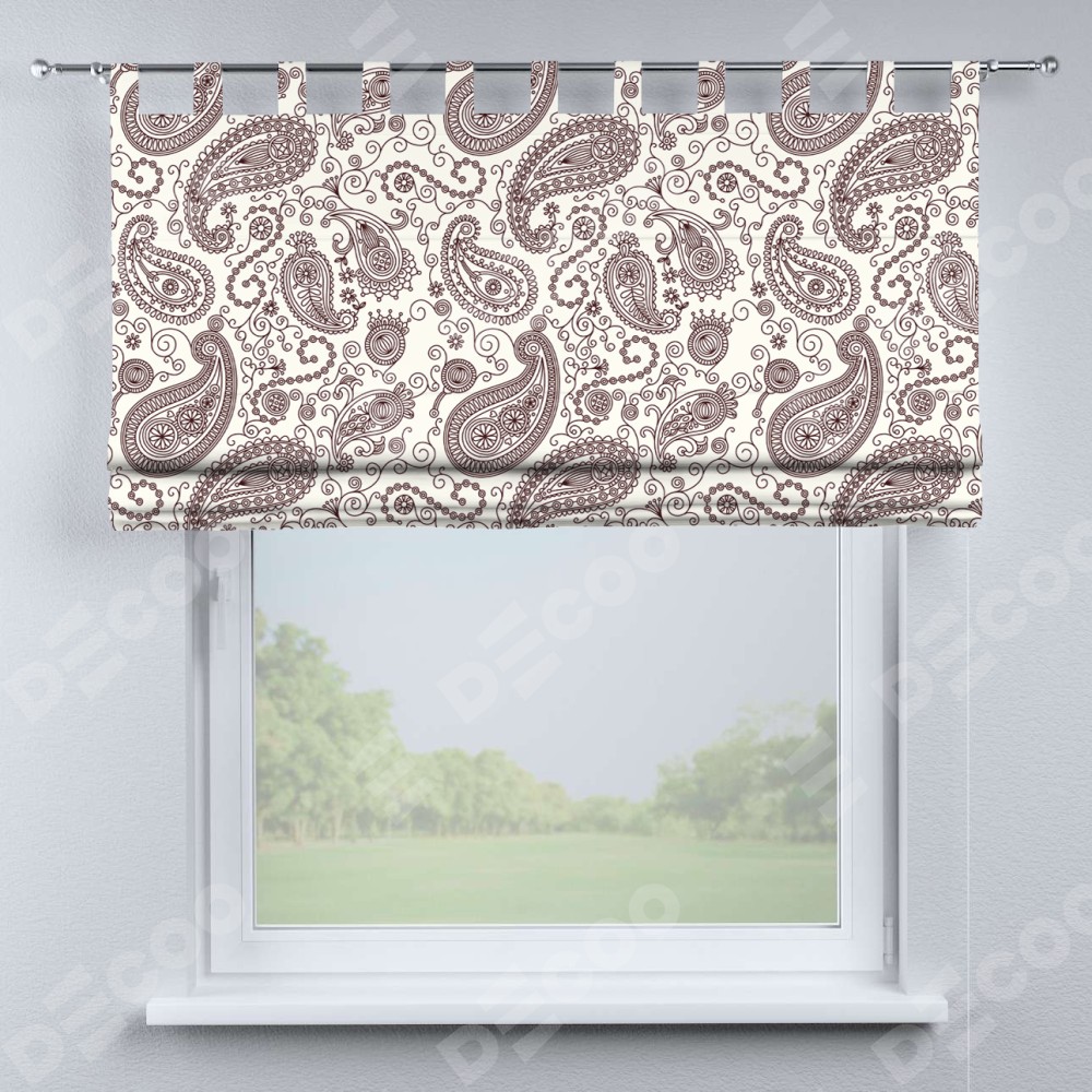 Римская штора производителя «Cortin», используется для проёма, пошита из ткани блэкаут с нанесением сублимационной печати «Индийский узор». Данная модель пошита на петлях, комплектуется на выбор круглым карнизом и подходит для монтажа на стену. Римская штора на петлях имеет простую систему регулировки высоты, отличительным преимуществом данной модели является простой способ монтажа. Достаточно повесить ее на трубу и штора готова!