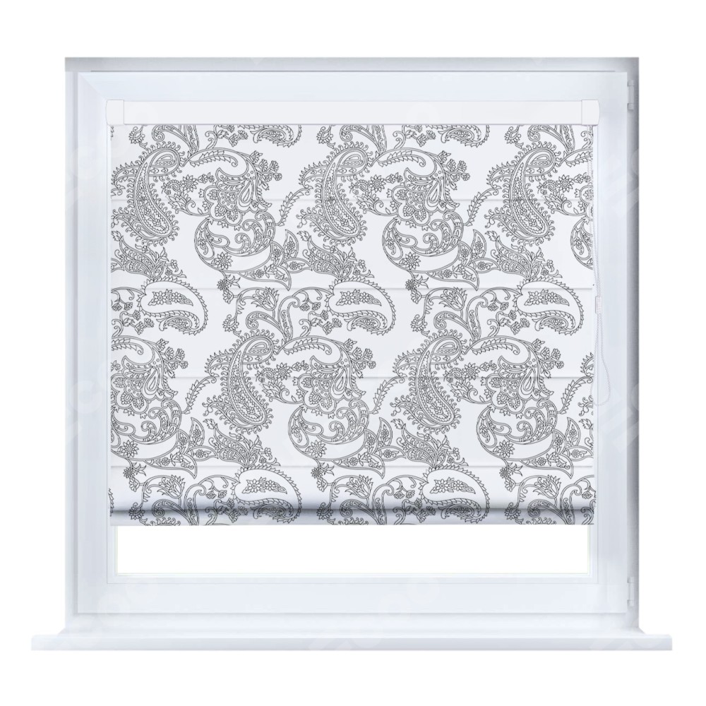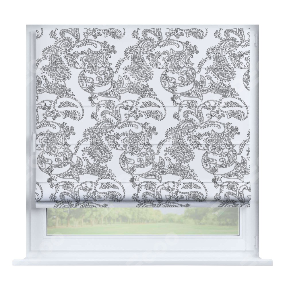 Римская штора производителя «Cortin», устанавливается на створку окна, пошита из ткани блэкаут с нанесением сублимационной печати «Светлый пейсли». Штора шьётся по индивидуальным размерам, для данного типа римской шторы возможная ширина от 35 до 150 см., высота до 250 см.