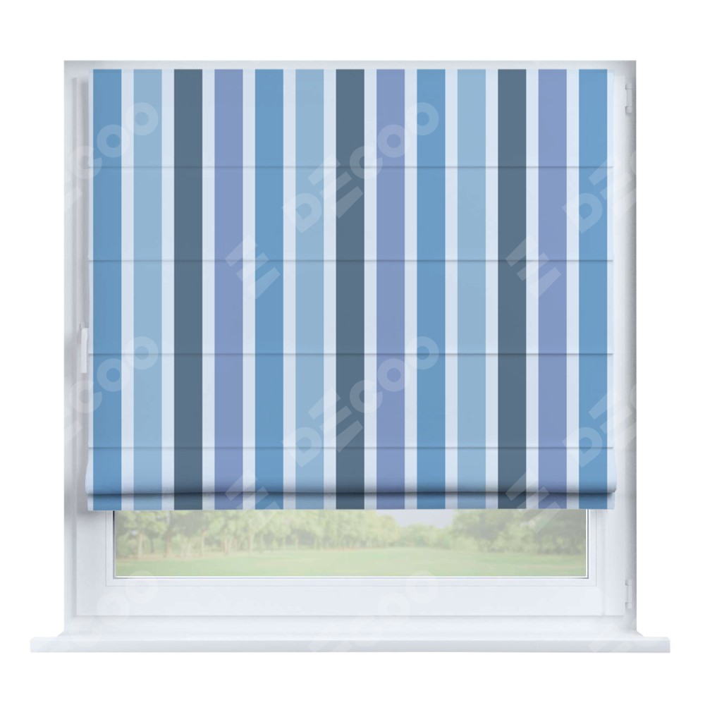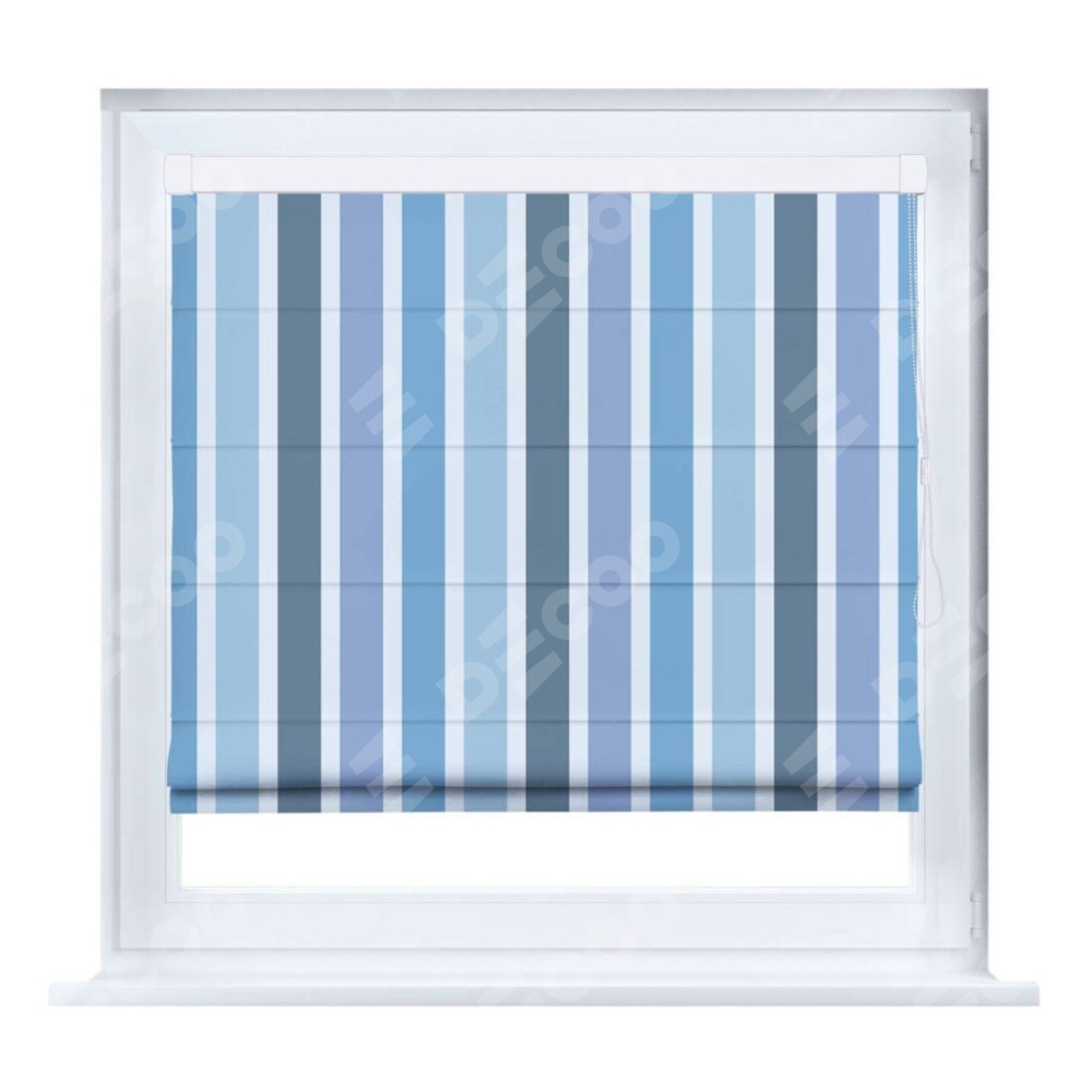 Римская штора производителя «Cortin», устанавливается на створку окна, пошита из ткани блэкаут с нанесением сублимационной печати «Сине-голубые вертикальные полоски». Штора шьётся по индивидуальным размерам, для данного типа римской шторы возможная ширина от 35 до 150 см., высота до 250 см.