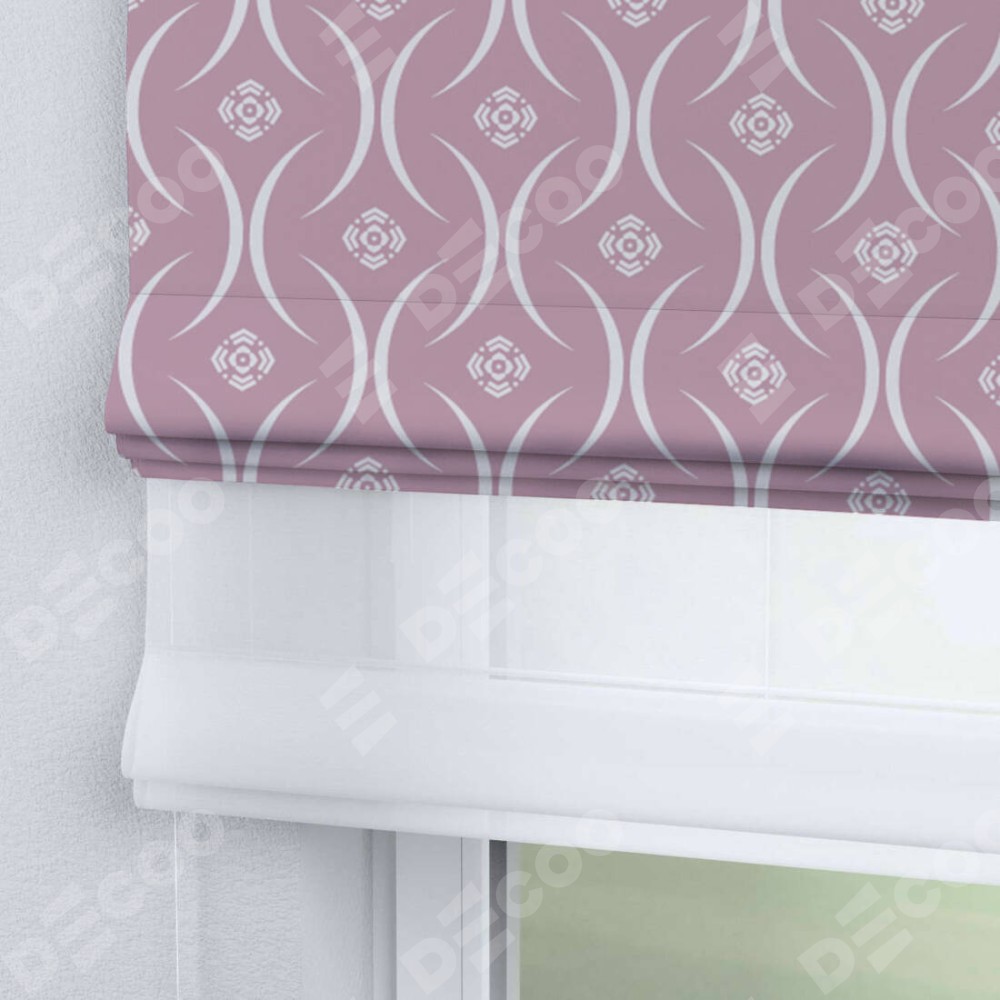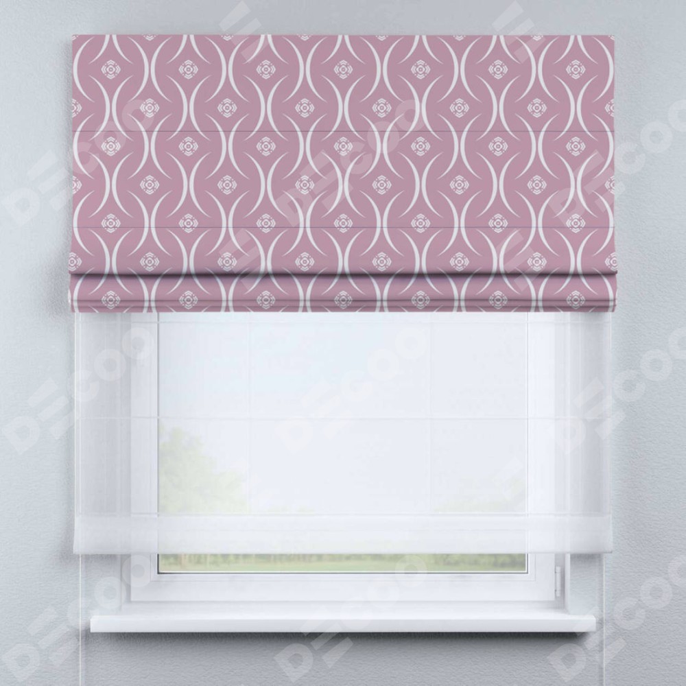 Римская штора день-ночь производителя «Cortin», используется для проёма, пошита из двух полотен, с лицевой блэкаут с нанесением сублимационной печати «Воздушный узор розовый», вторая ткань тюль (по стандарту комплектуется тюль белого цвета артикул V-01). Имеет универсальный механизм и подходит для монтажа: на потолок, на стену и в нишу.