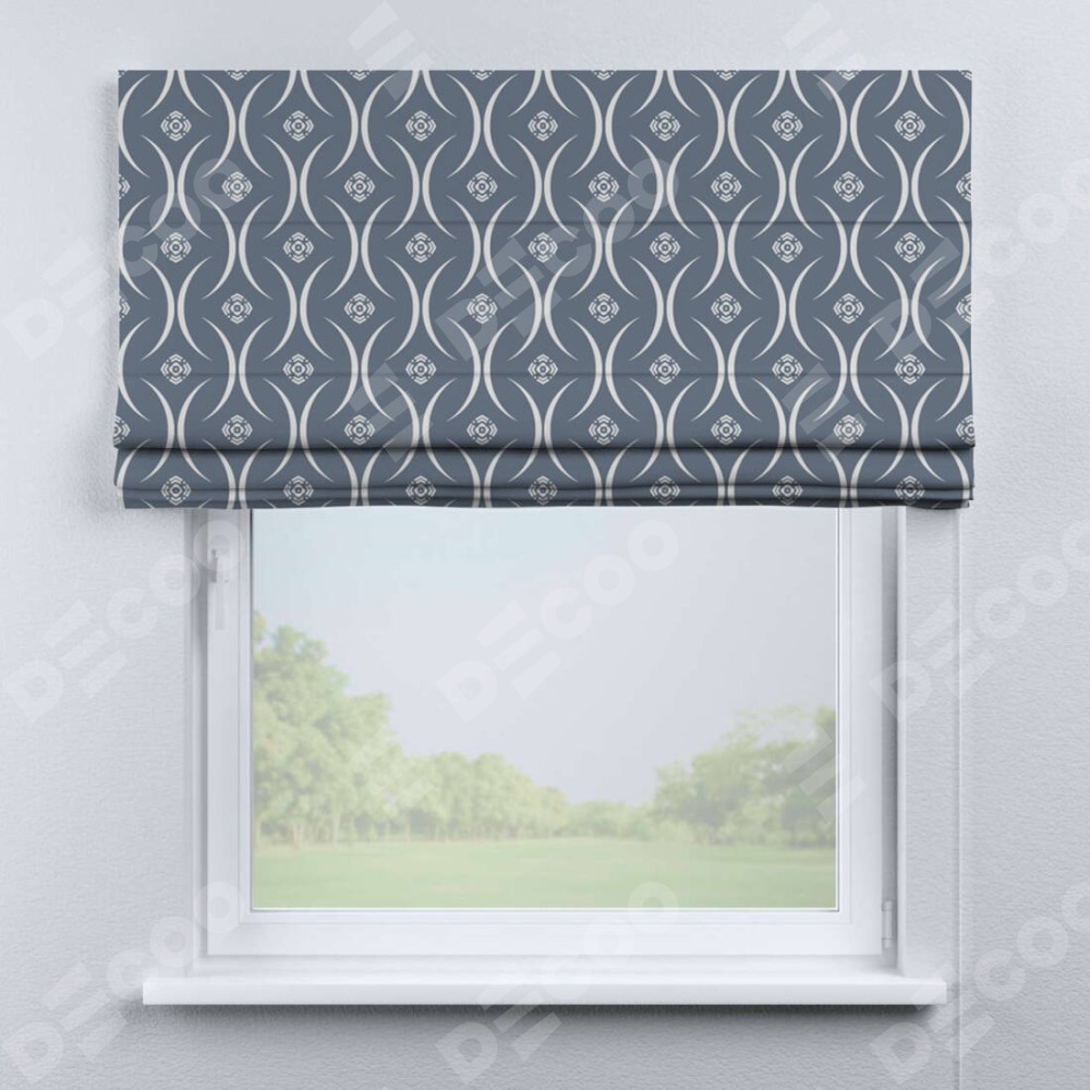 Римская штора производителя «Cortin», используется для проёма, пошита из ткани блэкаут с нанесением сублимационной печати «Воздушный узор серый». Имеет универсальный механизм и подходит для монтажа: на потолок, на стену и в нишу.