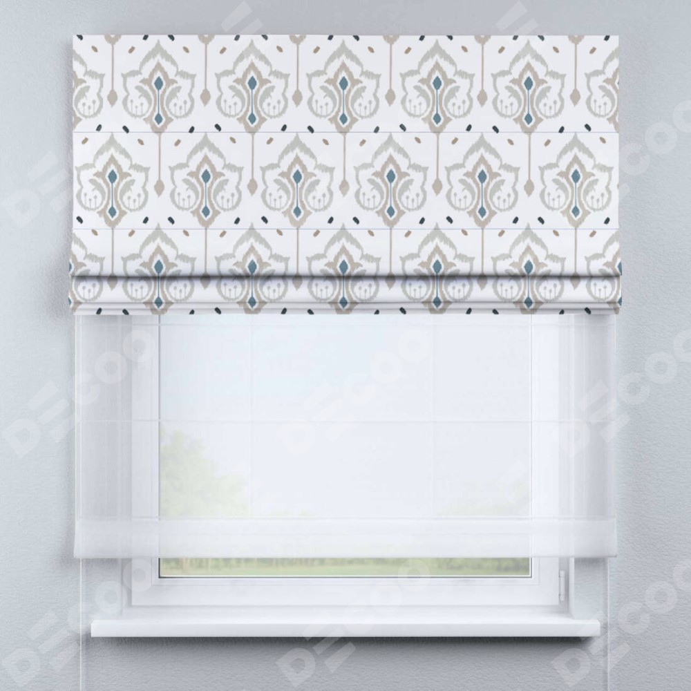 Римская штора день-ночь производителя «Cortin», используется для проёма, пошита из двух полотен, с лицевой блэкаут с нанесением сублимационной печати «Икат узор», вторая ткань тюль (по стандарту комплектуется тюль белого цвета артикул V-01). Имеет универсальный механизм и подходит для монтажа: на потолок, на стену и в нишу.